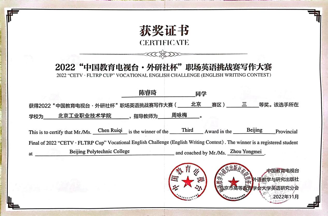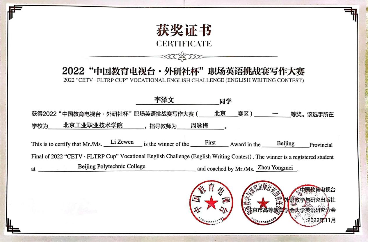 由中国职业技术教育学会、中国教育报刊社共同指导,中国教育电视台、外语教学与研究出版社联合主办的“中国教育电视台·外研社杯”职场英语挑战赛写作大赛(高职组)北京赛区成绩出炉。来自全市30余所高职院校的50多名学子以笔为锋,竞技文思,在挑战赛的舞台上精研写作技能,淬炼语言艺术,展青春风采,绽时代芳华。我校大数据与会计2032班的李泽文同学、网络2232班的白佳申同学、信息安全2131班的陈睿琦同学代表我校参加了此次大赛,李泽文、白佳申获得一等奖,陈睿琦获得三等奖,指导教师周咏梅老师获得优秀指导教师奖。