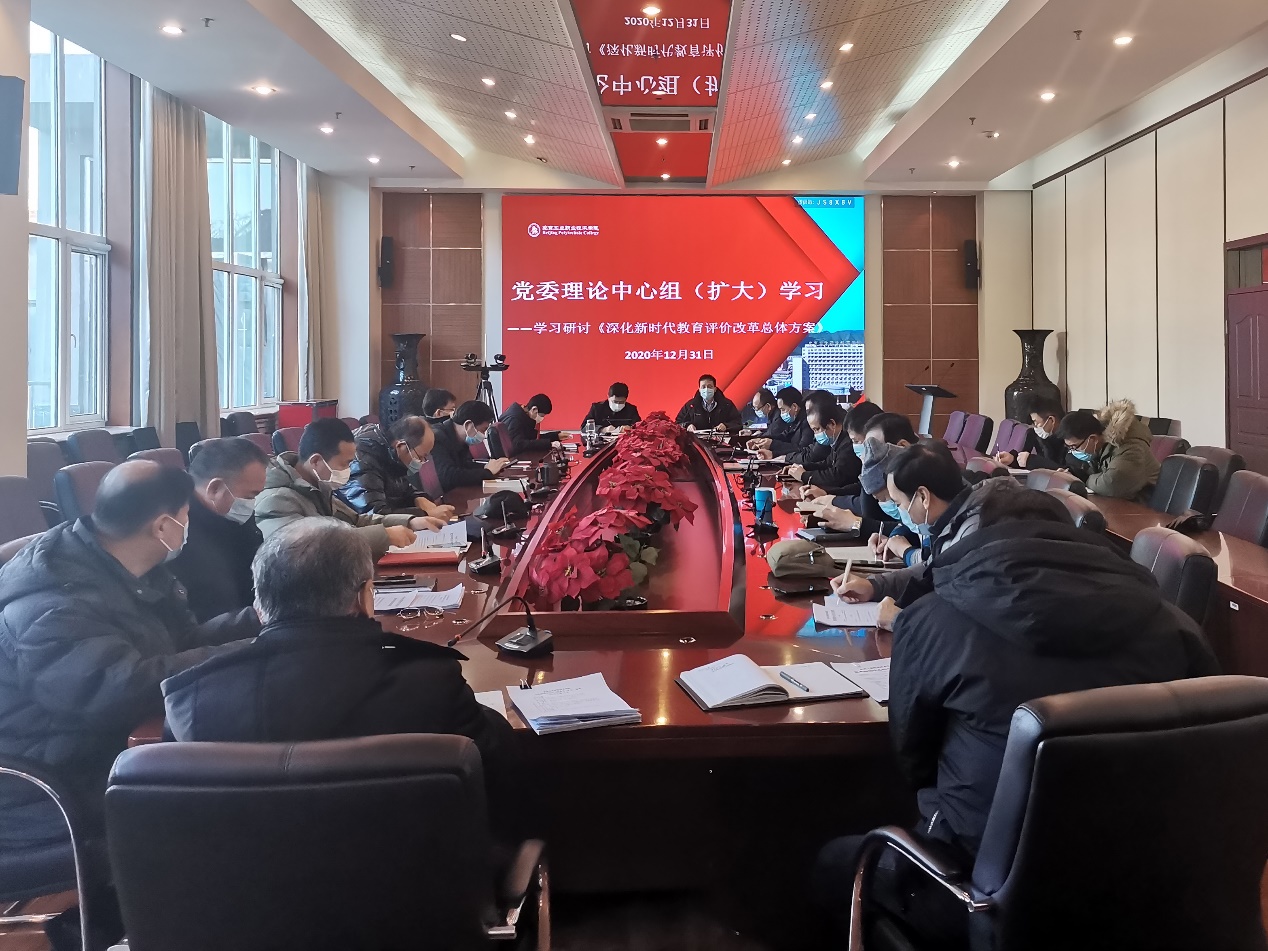 12月31日上午,爱体育手机官方网站入口党委理论学习中心组在第四会议室召开理论学习扩大会,专题学习中共中央、国务院印发的《深化新时代教育评价改革总体方案》(以下简称《总体方案》),研究部署爱体育手机官方网站入口学习贯彻落实的意见。校党委书记王伟主持学习会,党委理论学习中心组成员,党政办公室主任、宣传部长、学工部长、教务处长、人事处长、教学质量监控中心主任、党总支书记、直属党支部书记参加了学习研讨。