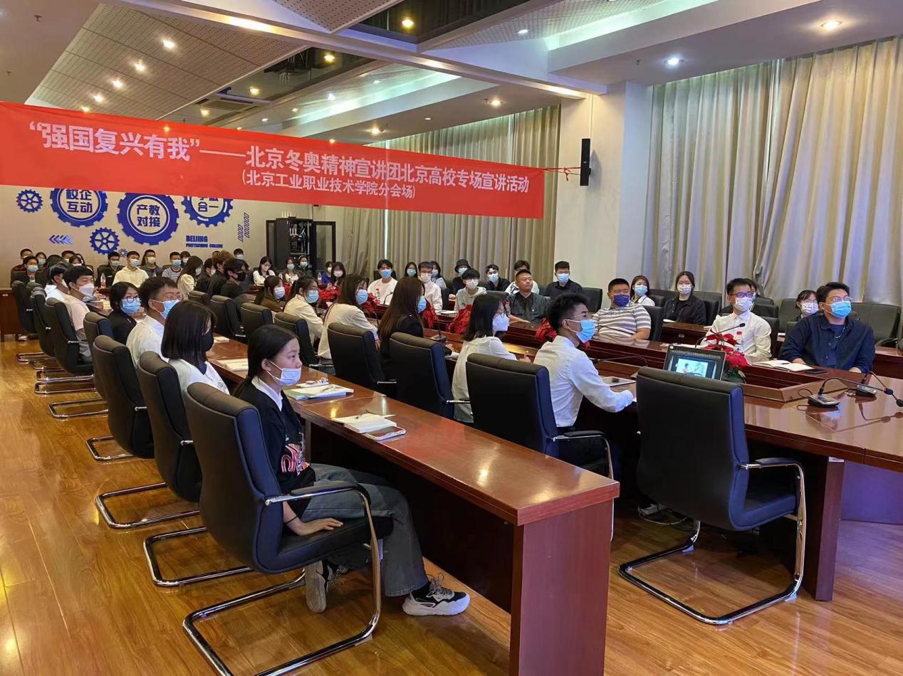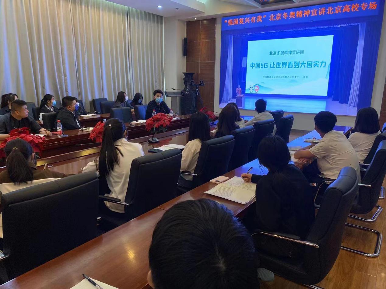 为扎实做好学生日常思想政治教育,推进实施新生引航工程,以实际行动迎接党的二十大胜利召开。北京市教育工作委员会于9月29日下午2:30,举行“强国复兴有我”——北京冬奥精神宣讲团北京高校专场宣讲活动,讲述青春故事,弘扬北京冬奥精神。活动在北京航空航天大学设主会场,我校于匠心楼第四会议室设分会场,校团委组织22级新生、学生干部和校冬奥宣讲团代表共同观看了本场活动。