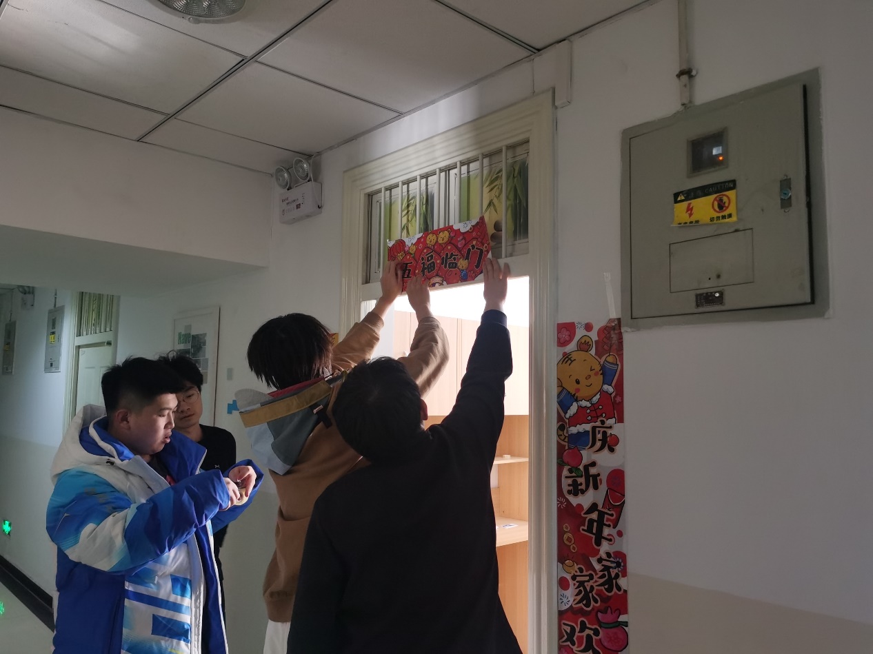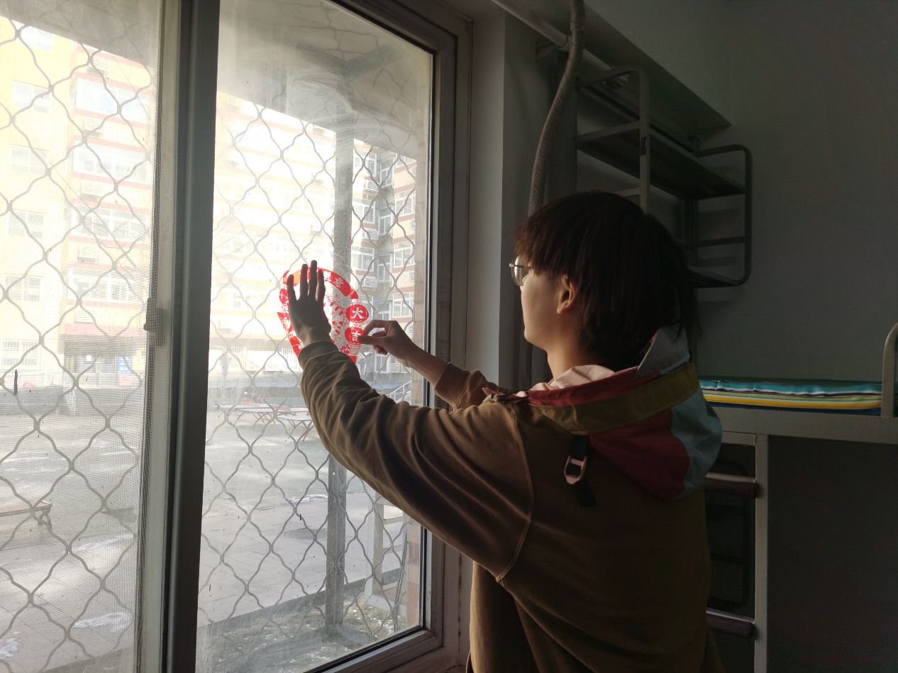 今日轮休的同学也早早起床,开始为度过人生中第一次离开家的春节做准备。拿出爱体育手机官方网站入口为志愿者准备的新年礼包,同学们三三两两的配合着贴上春联、福字、窗花,宿舍里顿时有了年味儿。