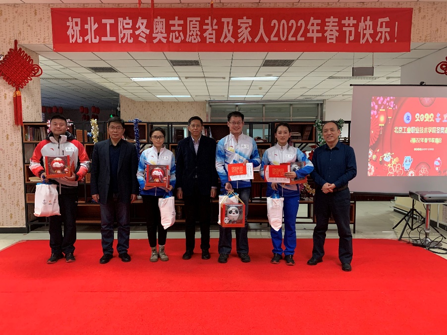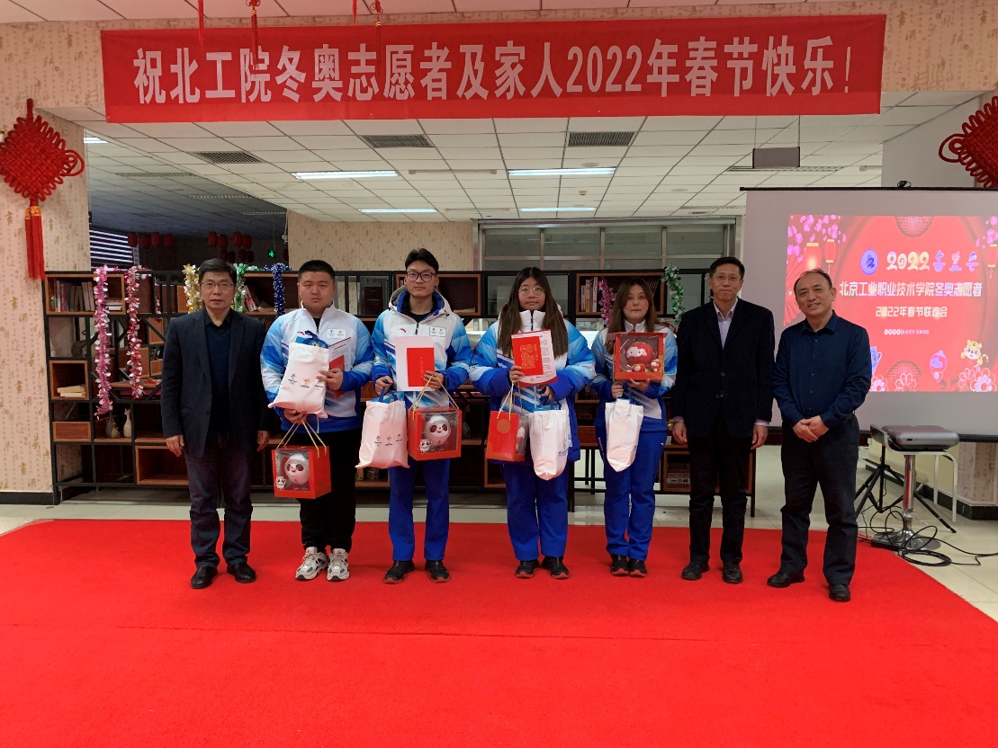 晚上5点半,今日上岗的志愿者们都已返校,大家齐聚食堂,年夜饭就要开始了。校领导和相关职能部门负责人也来到了会场和大家一起欢度除夕。党委书记高喜军向各位志愿者及家人表达诚挚的敬意,感谢志愿者们为北京冬奥作出的贡献,并寄语志愿者们在新的一年,“坚持‘三牛’精神,发扬‘三虎’精神,服务好北京冬奥会和冬残奥会,展现北工院学子蓬勃向上的精神面貌”。校长安江英为志愿者送上新春祝福,“祝愿全体志愿者及家人新春快乐,祝愿老师们、同学们在新的一年取得更大的进步”。校领导为志愿者送上了暖心包、冬奥吉祥物玩偶和感谢信。校领导和志愿者们围坐在一起,吃饺子、话家常,听同学们汇报志愿服务情况和留校过春节的感受,节日的氛围更加浓厚。