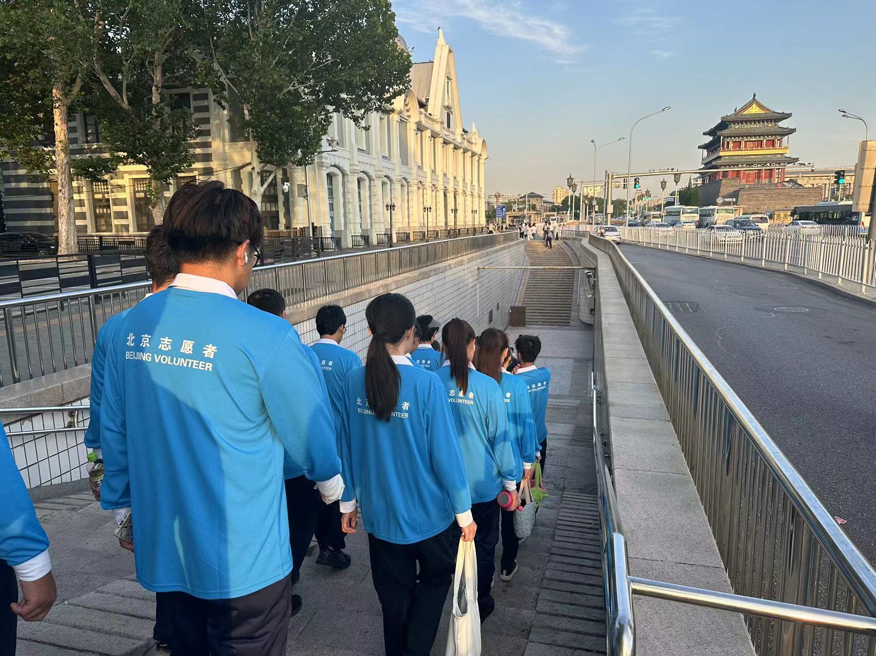 晨光初照,志愿者们身披第一缕温暖阳光,步伐坚定而整齐,列队步入庄严肃穆的毛主席纪念堂。