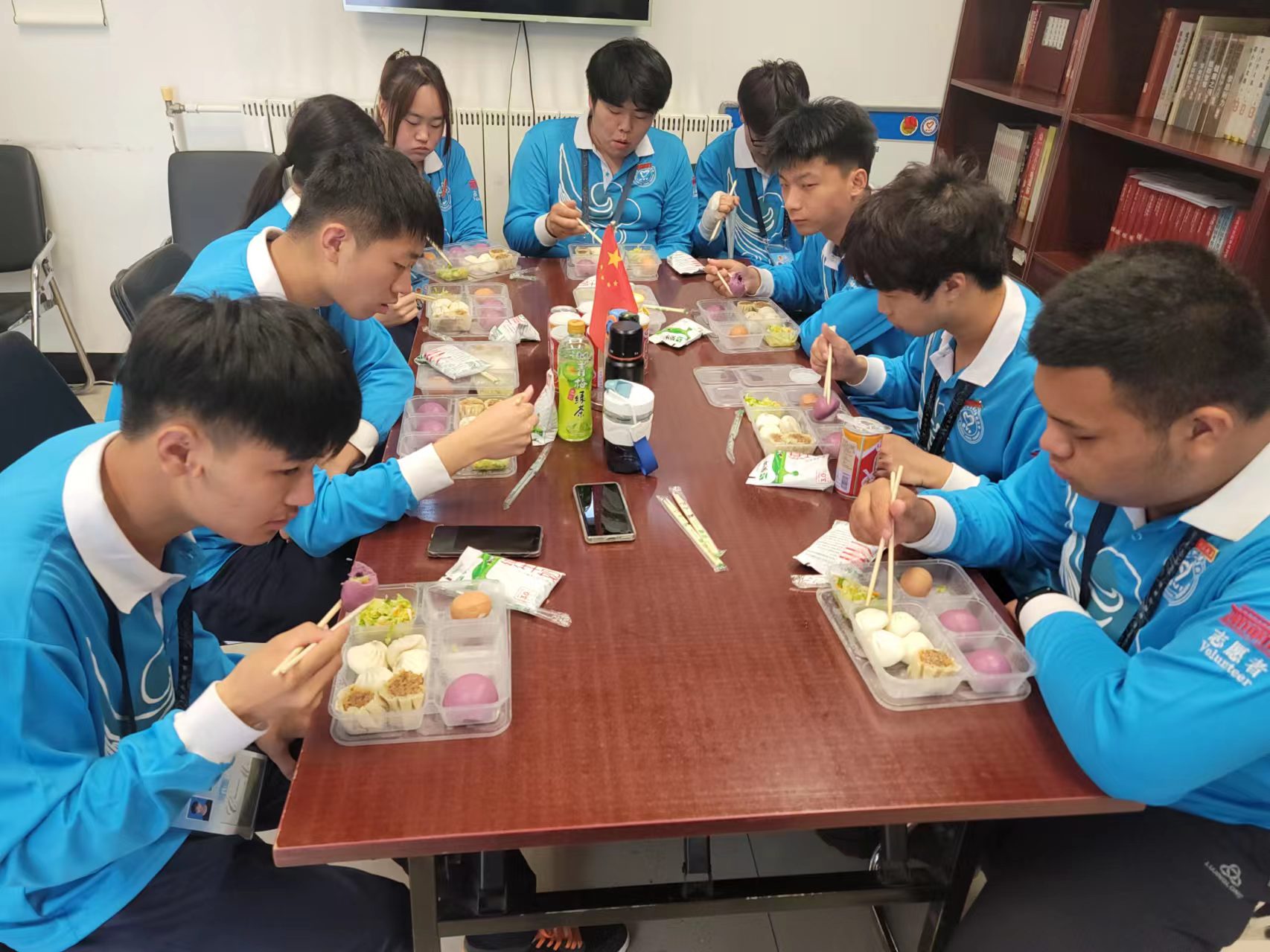 准时抵达休息室后,大家有序分组吃饭、接水、打扫好卫生,接着便怀揣着激动而紧张的心情,准备着今天的志愿服务。