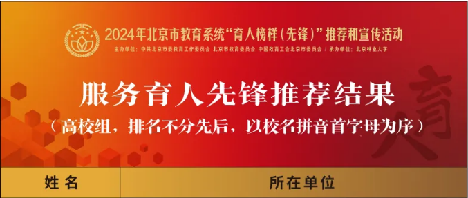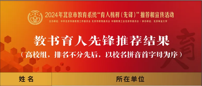 近日,北京市教育系统“育人榜样(先锋)”推荐结果揭晓,我校6名教师获北京市教育系统“育人先锋”称号。
