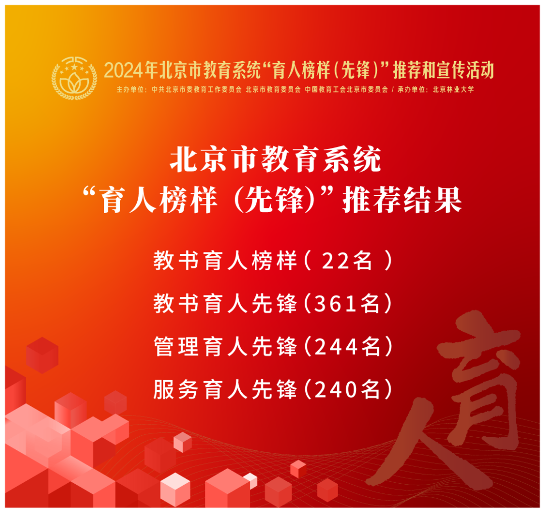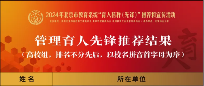 2024年北京市教育系统“育人榜样(先锋)”推荐和宣传活动由中共北京市委教育工委、北京市教育委员会、北京市教育工会联合开展。在爱体育手机官方网站入口党委的统一部署下,我校开展了校级“育人先锋”评选及北京市教育系统“育人榜样(先锋)”推荐工作。经相关程序,共评选出校级“育人先锋”18人,并从其中推荐老师参评北京市教育系统“育人榜样(先锋)”。经过评比,最终我校6人荣获北京市教育系统“育人先锋”,这是我校“全员育人、全程育人、全方位育人”的生动实践和重要成效。