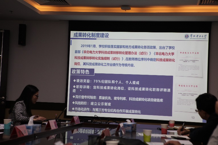 技术转移转化中心综合管理办公室主任刘晓介绍了华北电力大学成果转化制度建设、产学研合作、知识产权、技术合同登记等方面的基本情况和取得的成果。