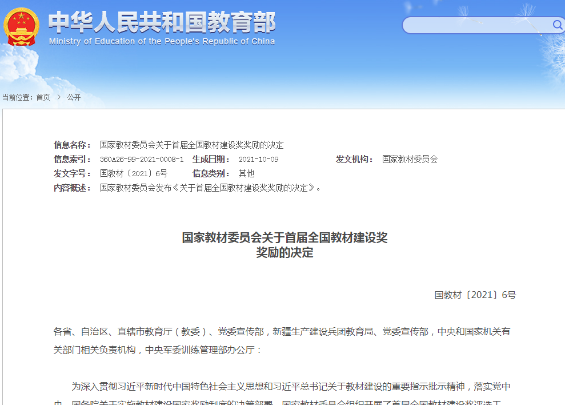 全国教材建设奖是教材领域的最高奖,是检阅、展示教材建设服务党和国家人才培养成果,增强教材工作者荣誉感、责任感,推动构建中国特色、世界水平教材体系的一项重大制度。