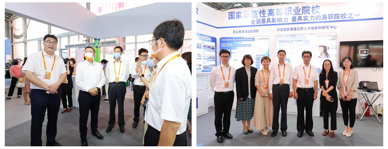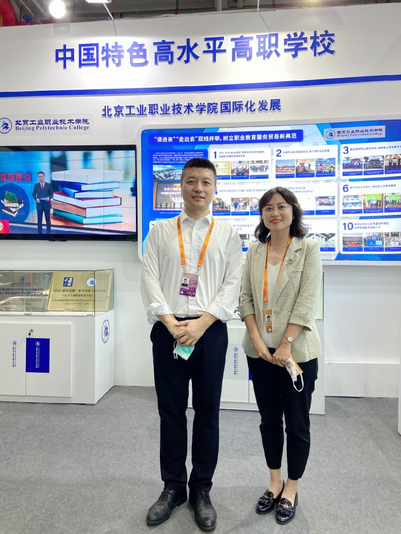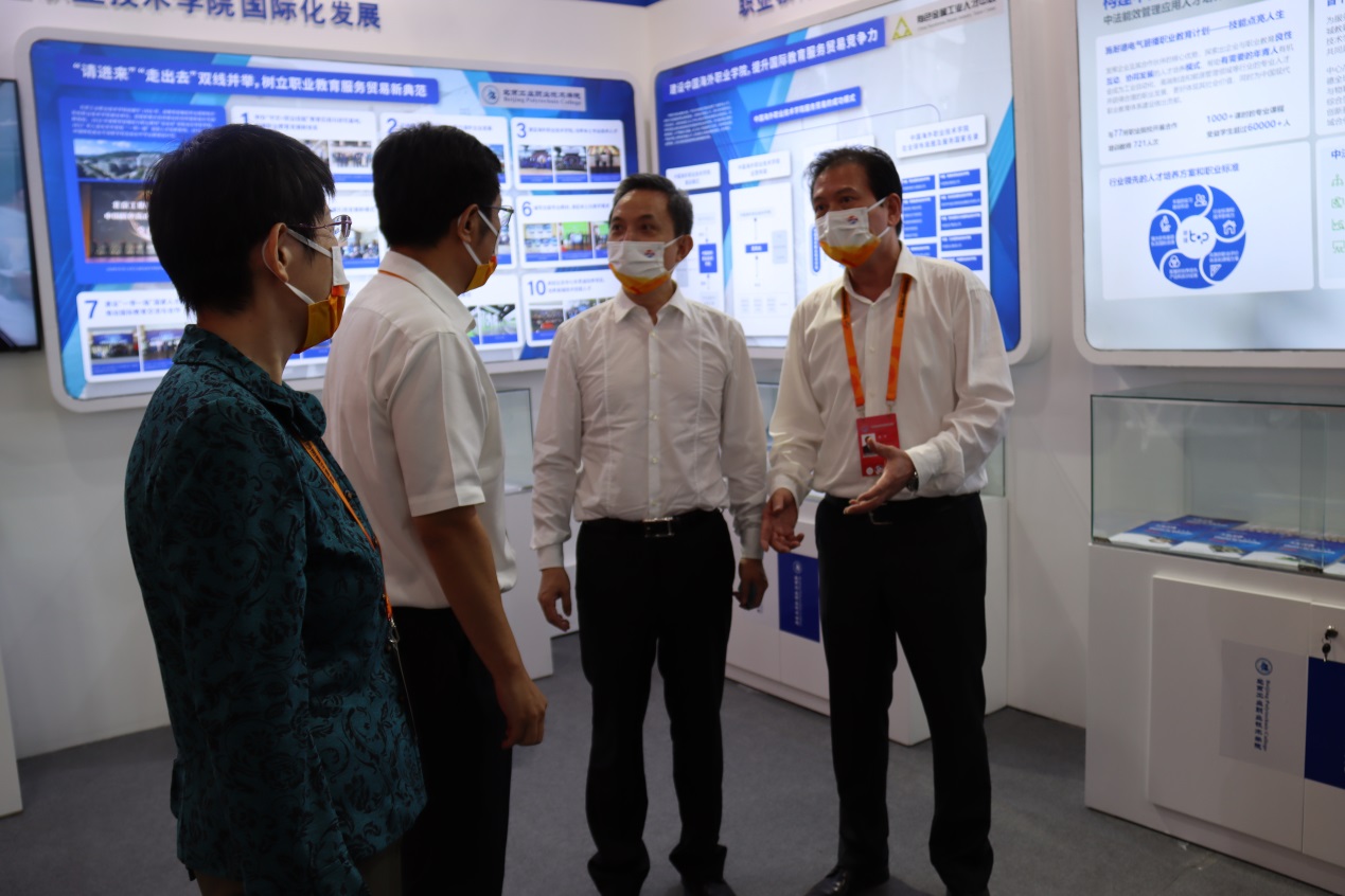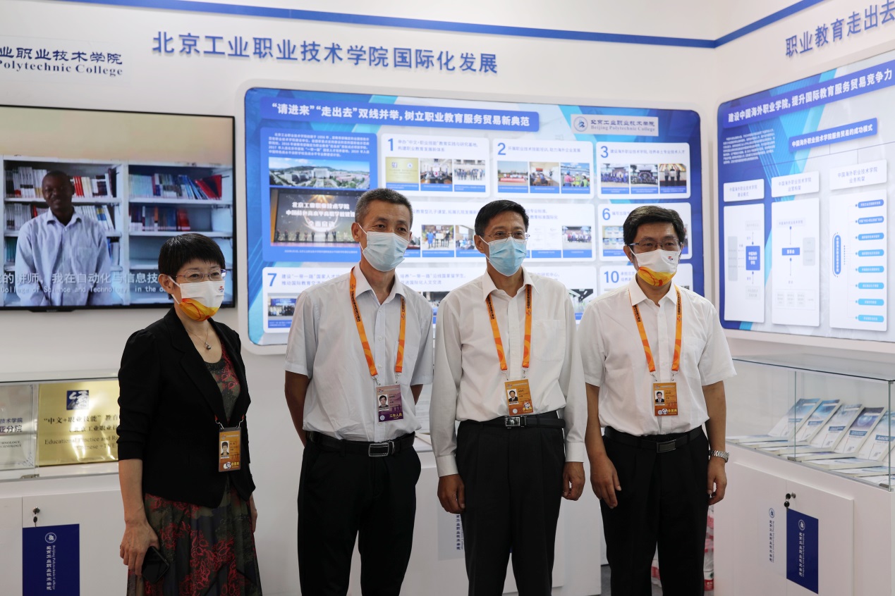 北京市副市长卢彦在北京市教委一级巡视员黄侃的陪同下莅临我校展位,安江英校长向其报告职业教育国际化最新成果