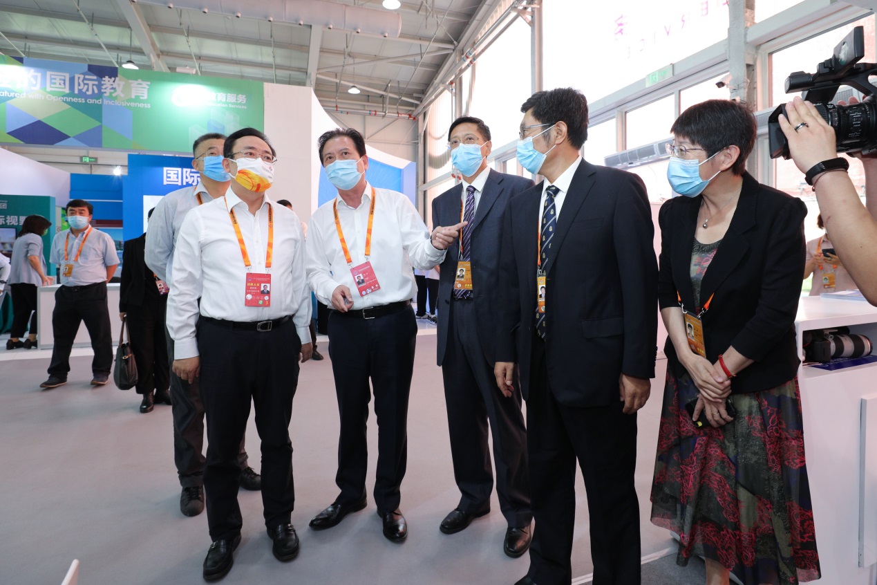 原教育部副部长、中国教育国际交流协会会长刘利民在北京市教委一级巡视员黄侃以及我校校领导的陪同下到我校展位观展指导