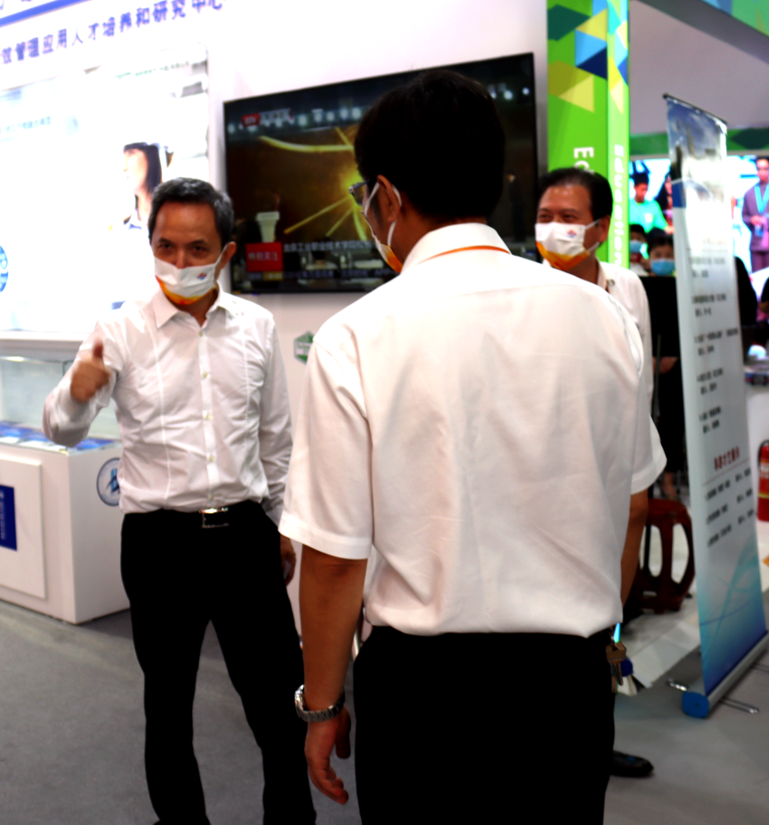 有色金属工业人才中心副主任宋凯,施耐德电气(中国)有限公司公共事务总监许屾、教育事务总监梁健等到服贸会现场支持我校参展工作