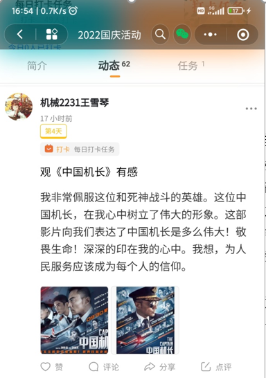 懿来读书社举办红色经典影片观影交流打卡活动,组织同学们在“十一”期间观看红色经典影片、交流观影体会,展现青年学生爱国爱党的精神风貌。
