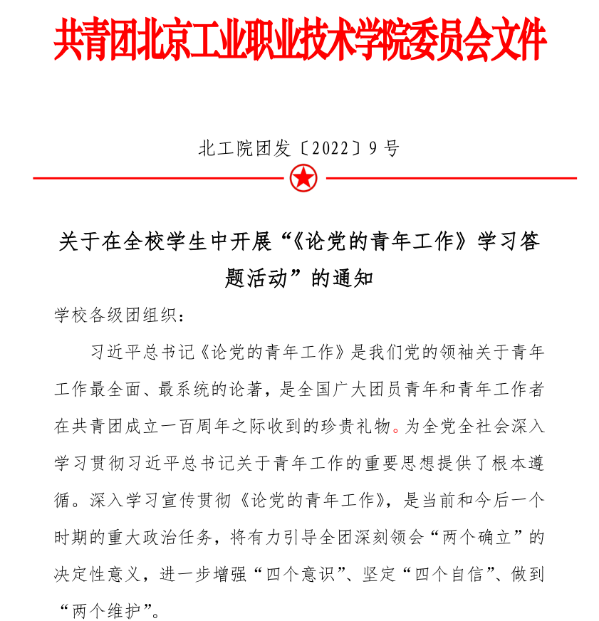 校团委在全校学生中开展了“《论党的青年工作》学习答题活动”,通过中国青年报答题平台,与全国职业院校学生一起学习党的领袖关于青年工作最全面、最系统的论著。各团支部开展“争做模范带头绽放美丽青春”主题团日活动,深入学习习近平总书记在庆祝中国共产主义青年团成立100周年大会上的重要讲话精神,通过冬奥志愿者、疫情防控志愿者等身边榜样的故事宣讲,引领广大团员青年落实新时代共青团员“五个模范、五个带头”的要求。