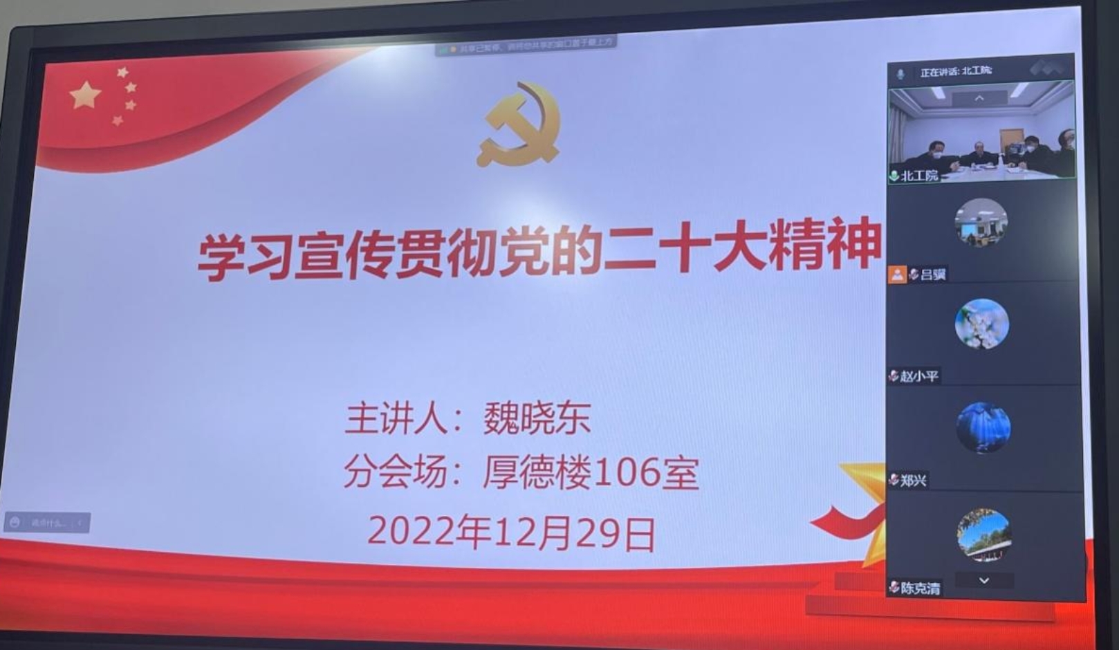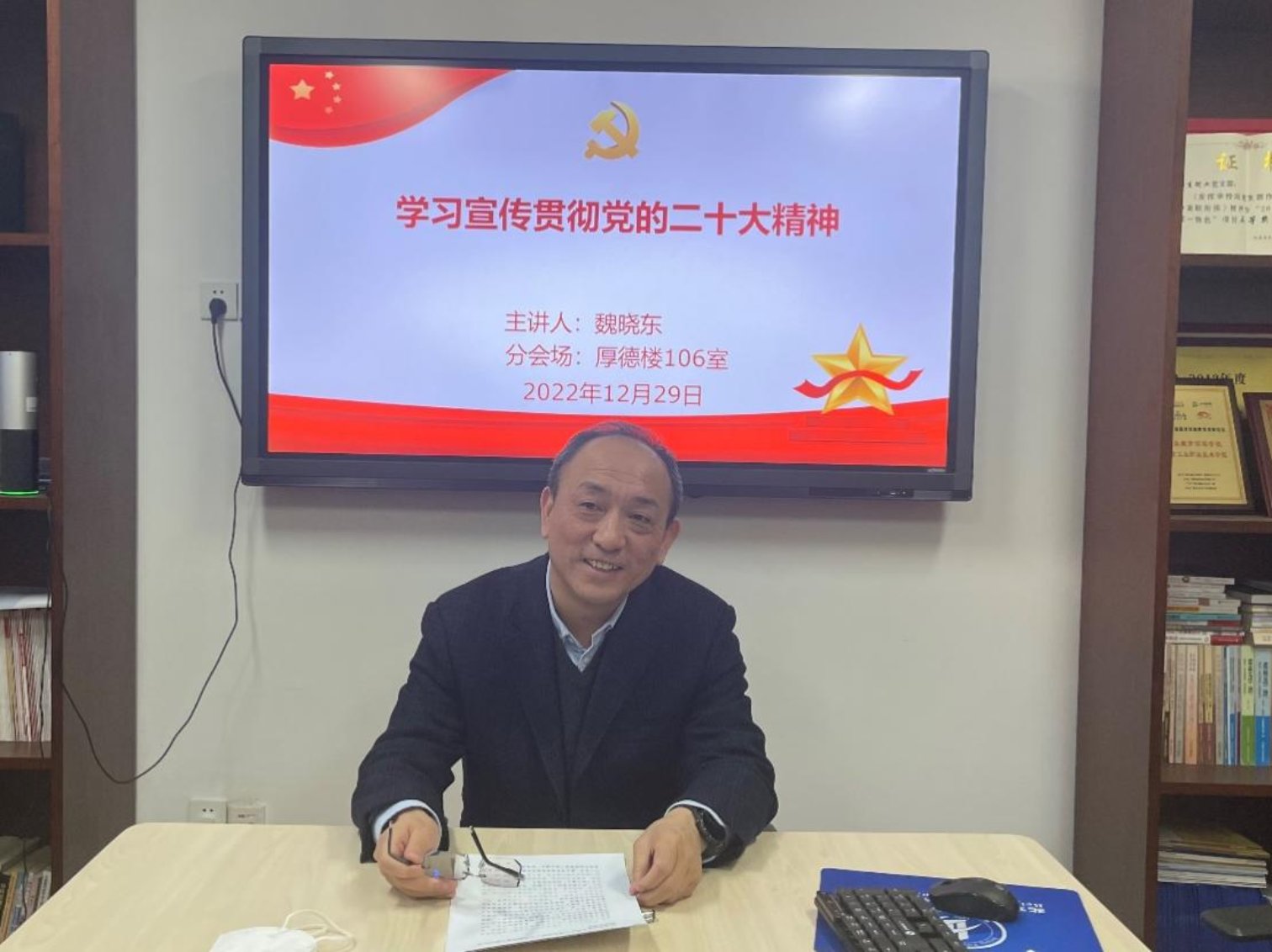 为持续深入学习宣传贯彻党的二十大精神,推动党的二十大精神深入基层、深入一线、深入师生,12月29日上午,爱体育手机官方网站入口党委副书记魏晓东采用“线上+线下”方式,为学工联合党总支、建筑工程与测绘学院党总支和校工会的党员干部开展党的二十大精神专题宣讲会,会议由学工联合党总支书记贺继伟主持。
