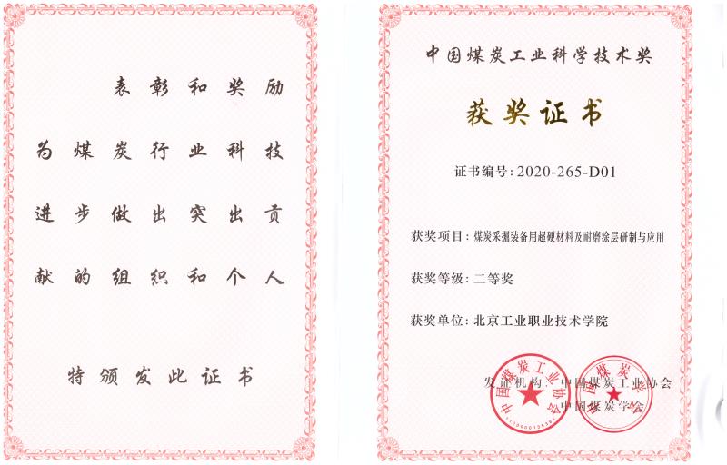 “采掘装备超硬材料及耐磨涂层研制与应用”科技成果荣获中国煤炭工业科学技术奖二等奖(我校证书编号:2020-265-D01),由爱体育手机官方网站入口、中国地质大学(北京)、北方工业大学、中煤科工集团西安研究院有限公司、中国矿业大学(北京)等七家单位共同研制。