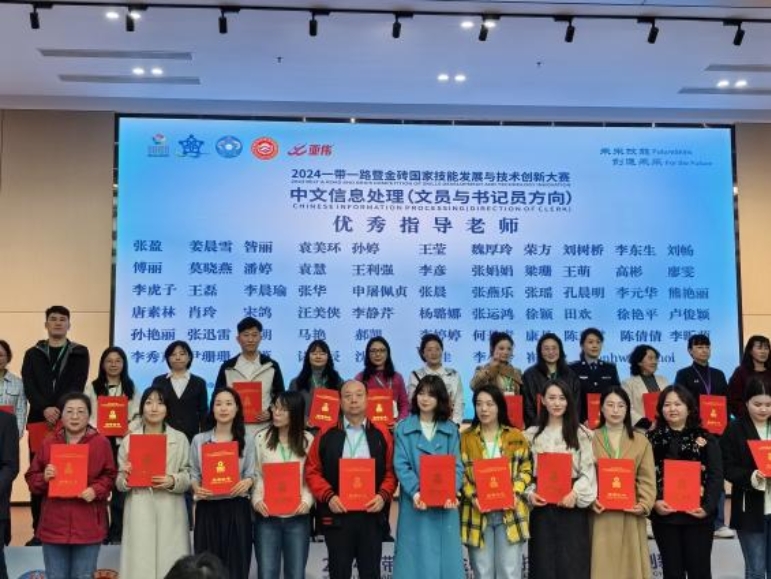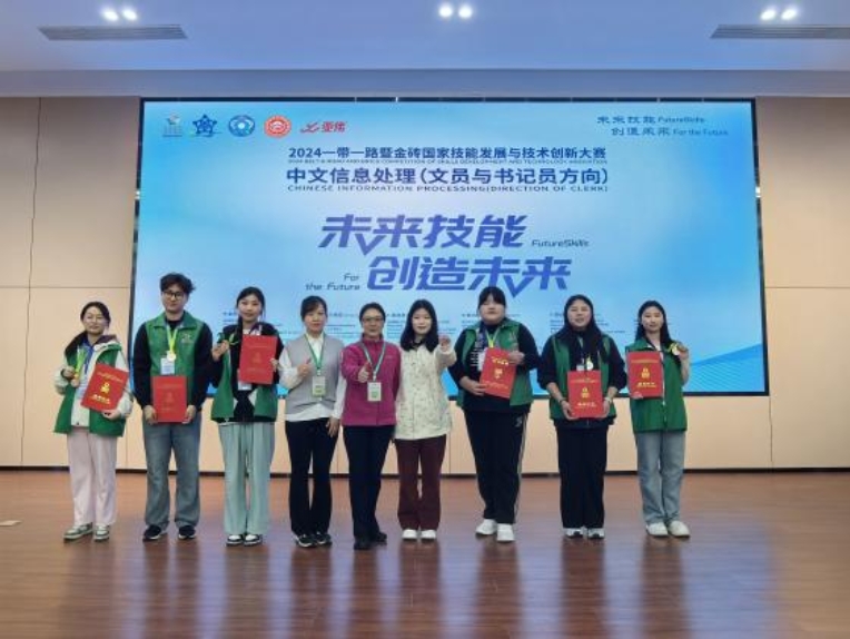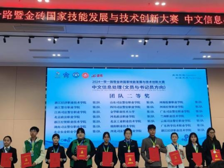 2025年3月28日,在2024年一带一路暨金砖国家技能发展与技术创新大赛中文信息处理(书记员方向)赛项全国总决赛上,我校文法与管理学院法律文秘2331班刘嘉琦、刘芯汝、季依童三位同学从三百余位选手中脱颖而出,斩获团队二等奖,该队的指导教师孙艳丽、张迅雷获得“优秀指导教师”荣誉称号。由郭洁、段宏毅两位老师指导的法律文秘2331班王语彤、胡奕琨、董云波三位同学获得团队三等奖,我校以出色的组织能力与教学水平荣获“最佳组织奖”,全面彰显我校在法学职业教育领域的综合实力。