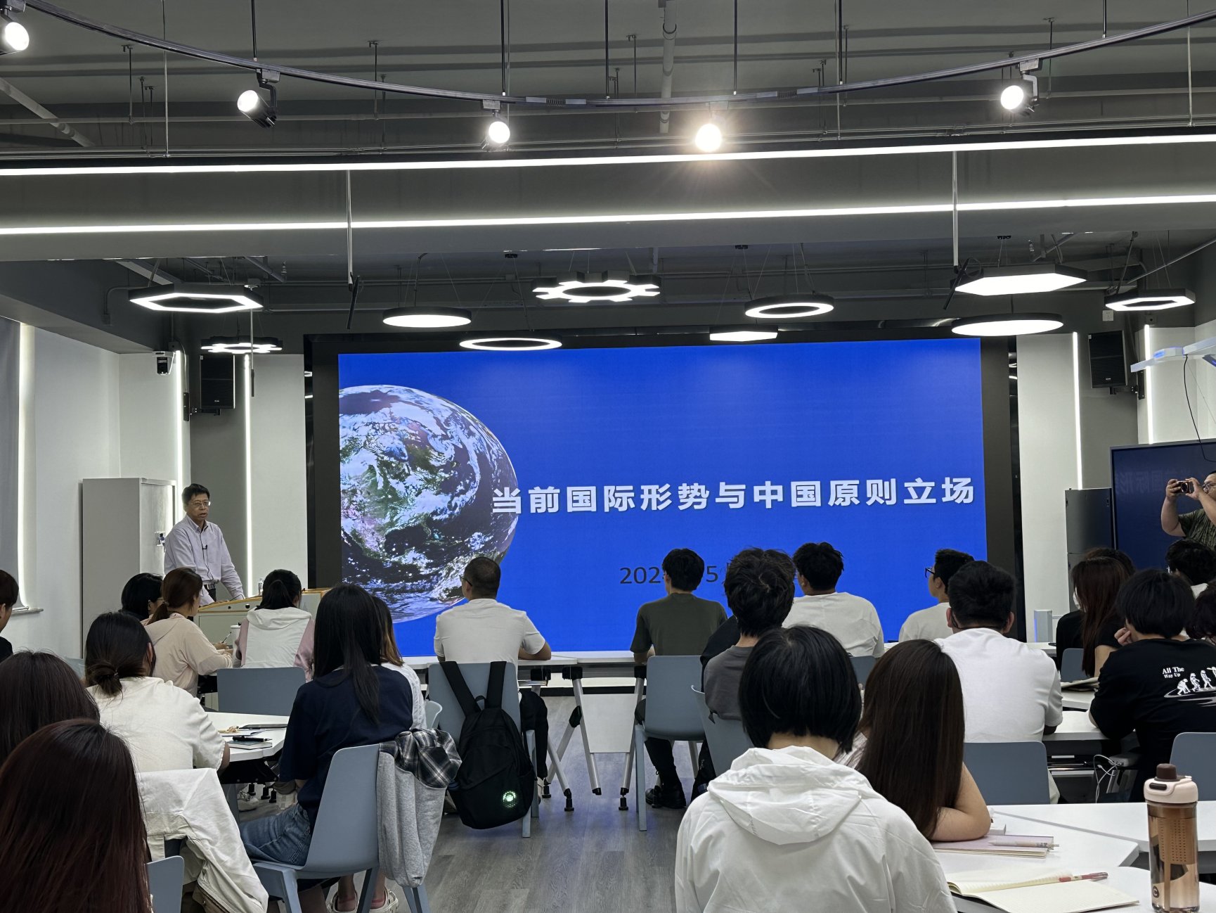 高喜军书记从动荡变革的世界、全球瞩目的热点和大国风范的外交三个方面,通过丰富的事例与详实的数据,为学生分析当前世界格局,深入浅出地讲解了中美关系、巴以冲突、俄乌冲突、全球经济发展形势、新征程上的中国外交等几个方面的内容。引导学生了解世界和中国发展大势,帮助学生深刻认识变革和动荡两种趋势持续演进、团结与分裂两种取向相互激荡的世界图景;深刻认识新时代中国以因势而谋、迎难而上的进取精神,坚持胸怀天下,推动构建人类命运共同体的大国担当。