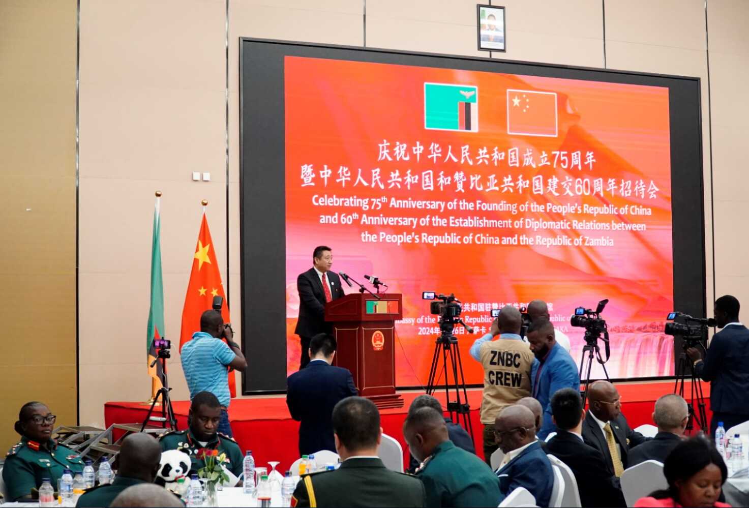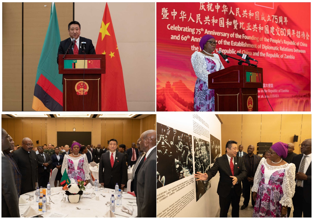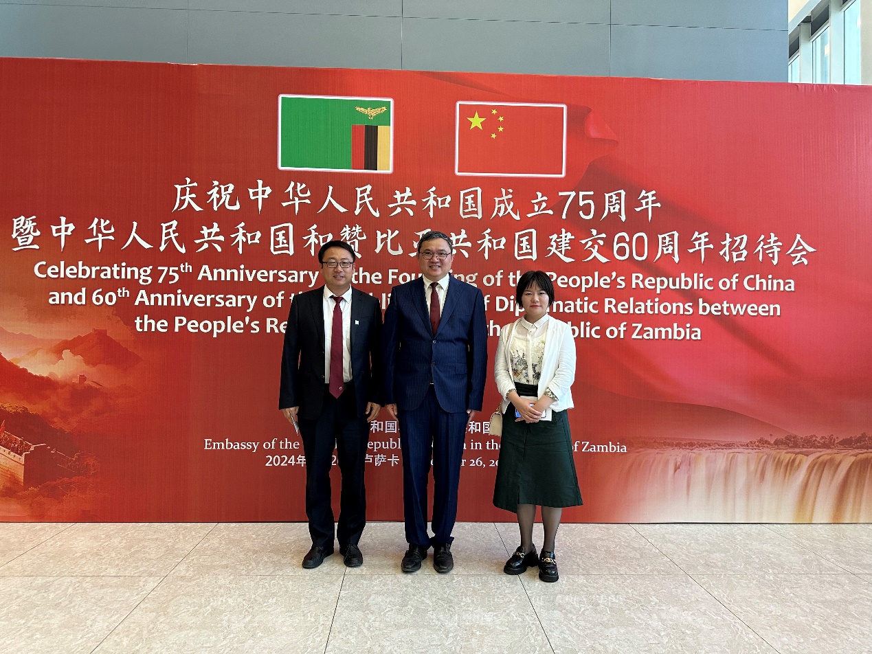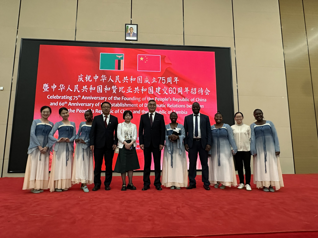 赞比亚当地时间9月26日,中华人民共和国驻赞比亚使馆在卢萨卡穆隆古希国际会议中心举办招待会,庆祝中华人民共和国成立75周年暨中赞建交60周年,赞比亚副总统纳卢曼戈及各界友人约800人出席了招待会,中华人民共和国驻赞比亚共和国特命全权大使韩镜在招待会上致辞,中赞职院及孔子课堂受邀参加了招待会。