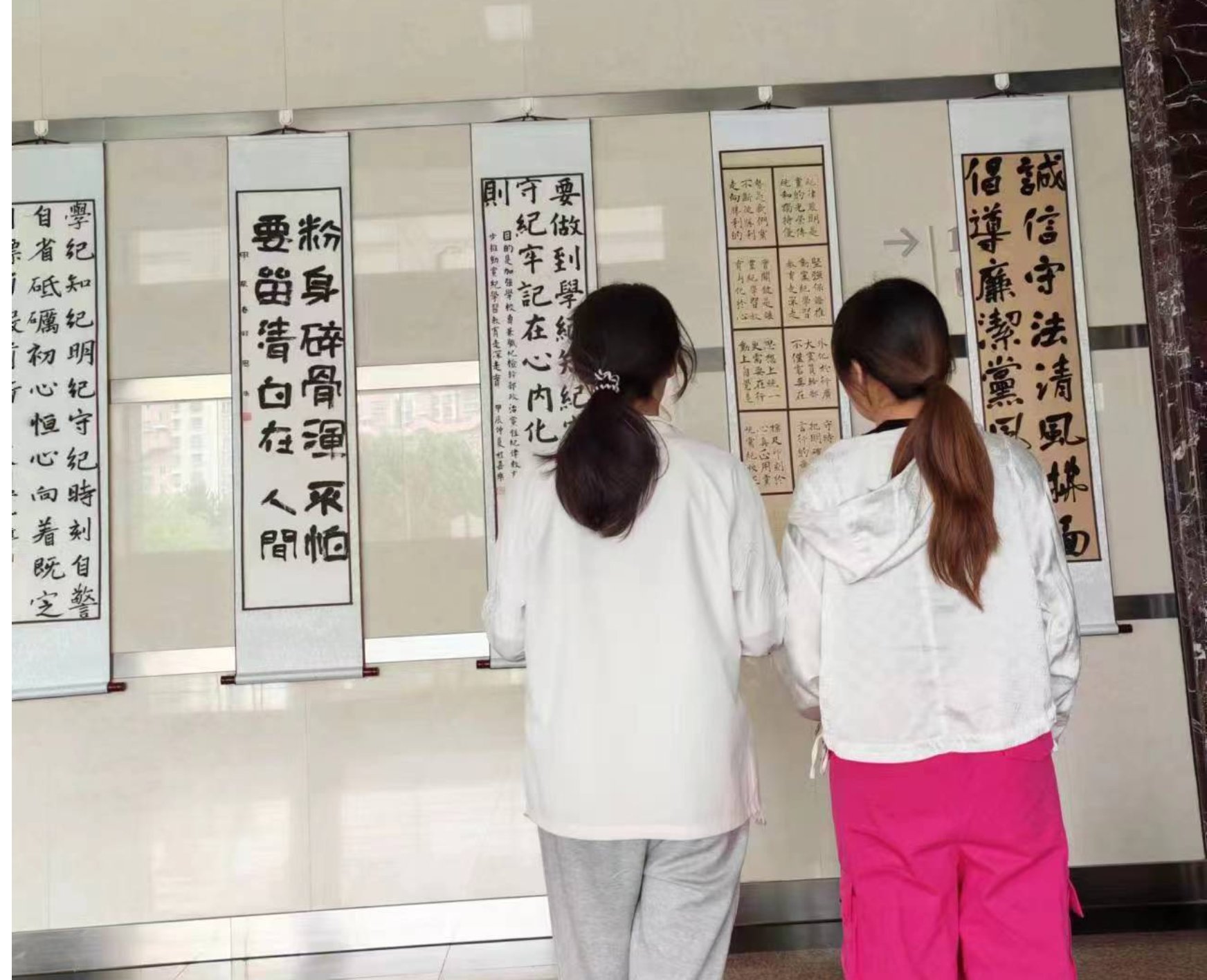 专题书画展由学院关工委、绘梦苑社团承办,共悬挂展览20副廉洁书画作品。活动现场,气氛热烈融洽。前来参观的师生一起品鉴作品、交流感想。在一句句耐人寻味、发人深省的名言警句,一幅幅苍劲有力、风神洒荡的艺术作品前,感受着激浊扬清、令人警醒的廉洁文化意境。
