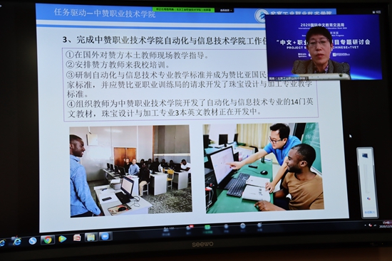 此次研讨会紧扣“新项目、新伙伴、新发展”主题,58个国家200余名中文教育和职业领域机构负责人、专家、企业代表踊跃参会,共同为推动“中文+职业技能”项目高质量、可持续发展建言献策。周燕副校长从国内师资培养和海外分院(中赞职业技术学院自动化与信息技术)师资培养两方面介绍我校经验,提出了以“任务驱动”、“政策驱动”和“自我驱动”为主的国内师资培养思路和培养本土化教师的海外师资培养思路。