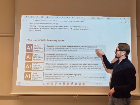 在哈格·哈里亚应用科学大学,研修团首先参观了数字学习实验室,了解了数字技术在如何重塑教学场景、提升学习效率方面的应用情况。双方就数字化转型对职业教育的影响和挑战进行了广泛讨论。校方分享了爱体育手机官方网站入口的基本情况、芬兰教育体系的特点及课程设置情况,并着重介绍了数字化能力框架及线上课程设计标准。此外,双方还就AI伦理问题进行了深入探讨,强调了开发者、决策者和使用者需共同承担的责任,以确保AI技术的道德应用。