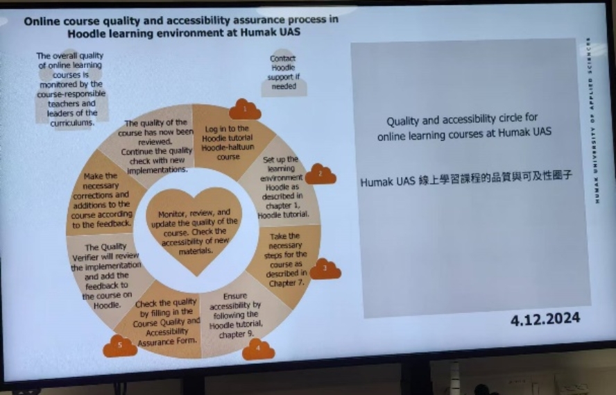 在芬兰人文应用科技大学,研修团深入了解了该校在线学习的开展情况。该校课程设置丰富多样,涵盖社区教育、文化产业管理、口语和语言无障碍等多个领域。在线上学习方面,该校采用了多种先进的互动工具和平台,并注重跨学科合作,确保线上线下作业安排的合理性和科学性。在质量保障方面,该校制定了严格的质量准则和指导手册,并设有专人负责课程质量的保障工作。同时,该校还试点利用AI技术给学生提供额外反馈,进一步提升学习效果。