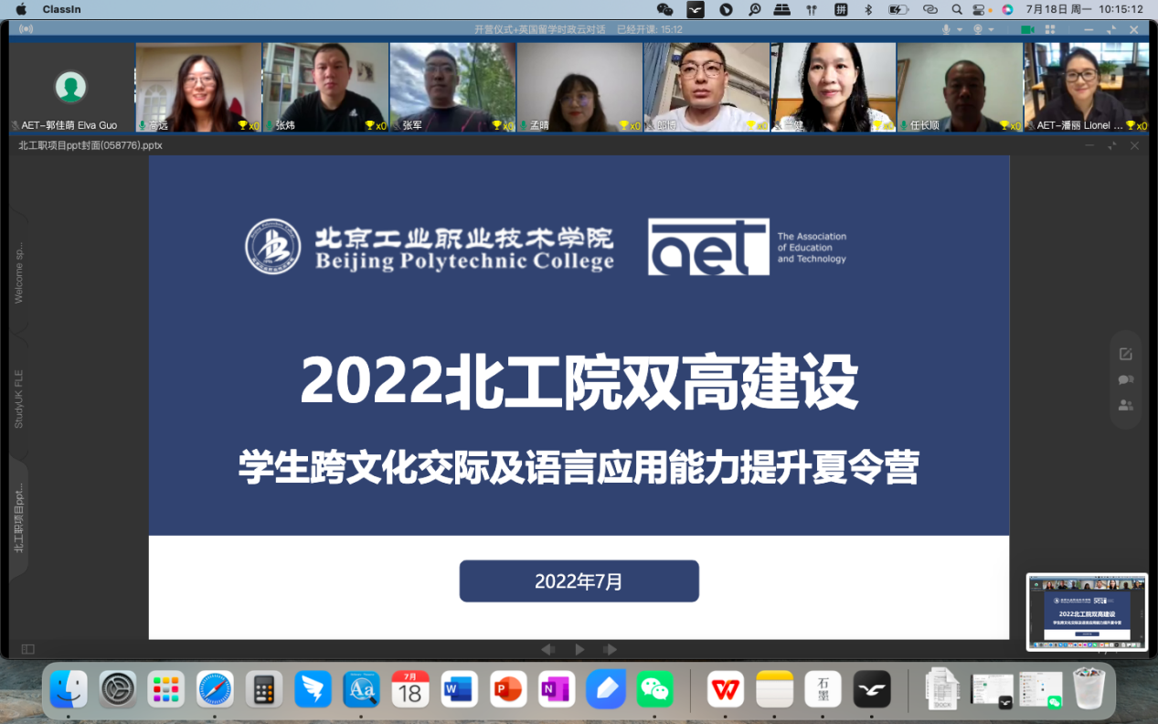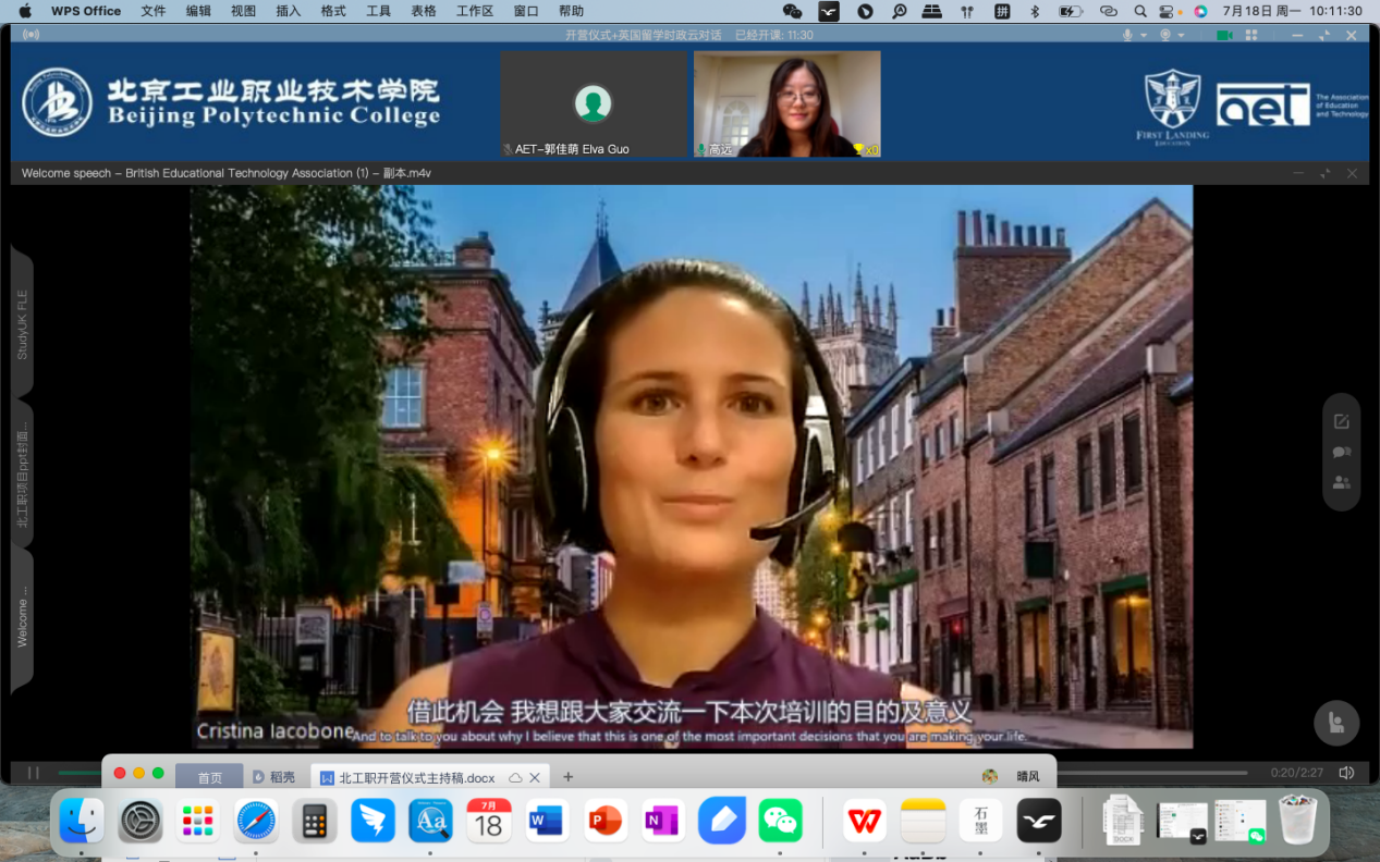 2022年7月18日上午10点,北工院双高建设-学生跨文化交际及语言应用能力提升夏令营于线上顺利开营。本次夏令营为期10天,来自机电工程学院、建筑与测绘工程学院、信息工程学院、文法与管理学院以及基础教育学院5个学院50名优秀学生共同参加了此次夏令营。开营仪式由我校国际处高远老师主持,英国教育科技协会夏令营项目学术负责人Cristina Iacobone女士、我校国际处副处长孟晴、机电工程学院副书记兰健,建筑与测绘工程学院副书记任长顺,信息工程学院副书记郎博,文法与管理学院副书记张军,基础教育学院副书记张炜,以及英国教育科技协会国际事务联络总监潘丽等领导共同出席了本次夏令营开营仪式。