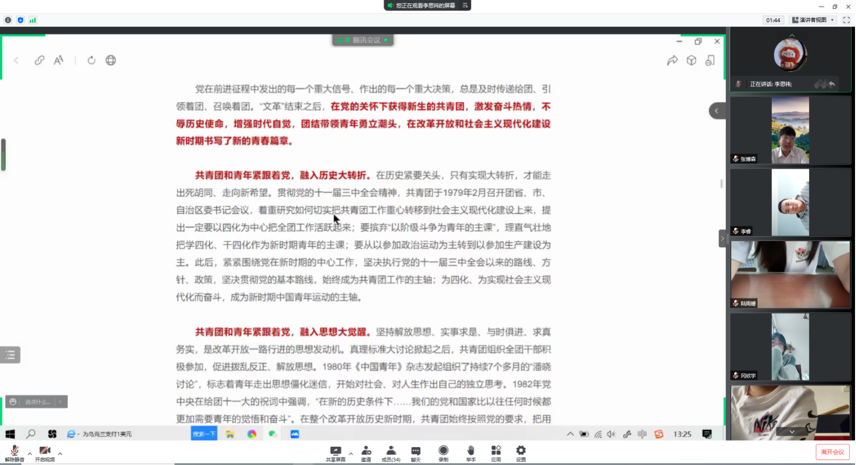 文法与管理学院团总支组织团员青年们同上“青春心向党,百年再起航”主题云团课。引导团员青年更加深入、透彻、扎实地学习宣传贯彻习近平总书记重要讲话精神。本次主题团课采用融媒体展示、沉浸式讲述等多种新媒体展现方式,内容共设青春向党、青春乐章、青春模样三大篇章,结合大量历史资料,带领大家用可视化的方式学原文、学原著,共同学习感悟习近平总书记重要讲话的重大意义和深刻内涵。