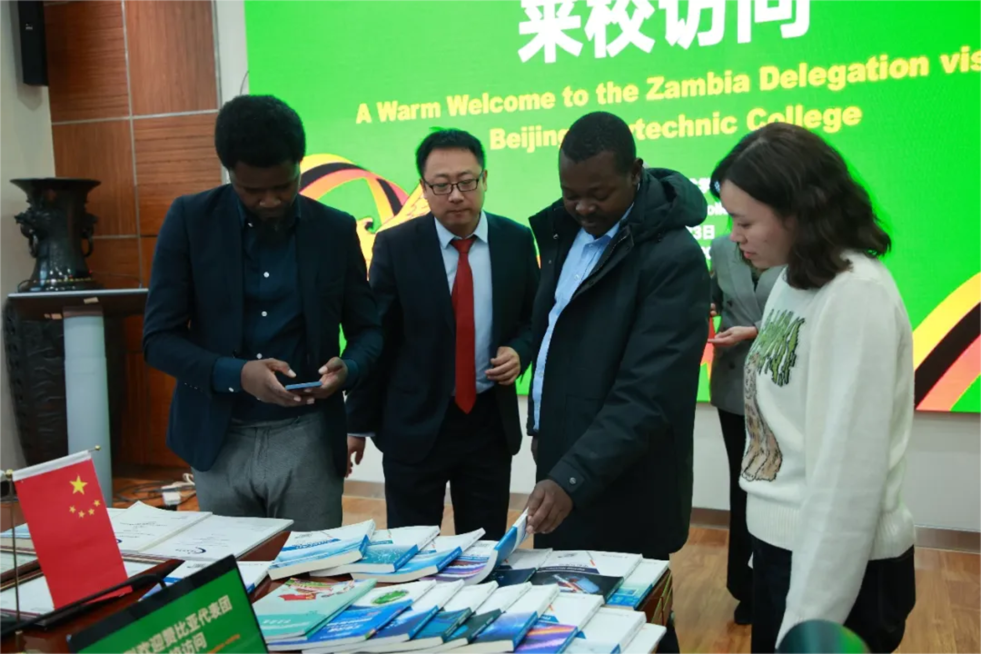 交流结束后,双方共同观看了中赞职院第二届毕业生的毕业典礼及毕业生双选会视频,目前,中赞职院全部毕业生均已在当地实现就业。访团代表还翻阅了我校为中赞职院开发的教学资源,包括纳入了赞比亚国民教育体系的2项专业标准和37项课程标准,以及17本专业英文教材和4本工业汉语教材,对中赞职院的丰硕办学成果和人才培养质量予以了充分肯定。
