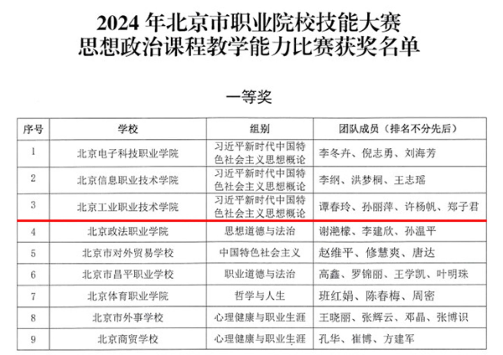 近日,2024年北京市职业院校技能大赛思想政治课程教学能力比赛圆满落幕。经过激烈角逐,我校两支参赛团队脱颖而出,“习近平新时代中国特色社会主义思想概论”团队荣获一等奖,“思想道德与法治”团队荣获二等奖。
