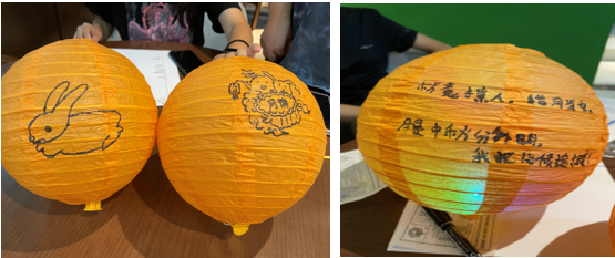 活动主要包含制作灯笼和猜灯谜两部分,在制作灯笼活动中。同学们在图书馆一层大厅有序领取制作材料,在听取中秋故事及制作讲解后,大家纷纷开始动手制作。有的同学在灯笼上画出月兔的图案,有的同学在灯笼上写下中秋诗句,各具特色。