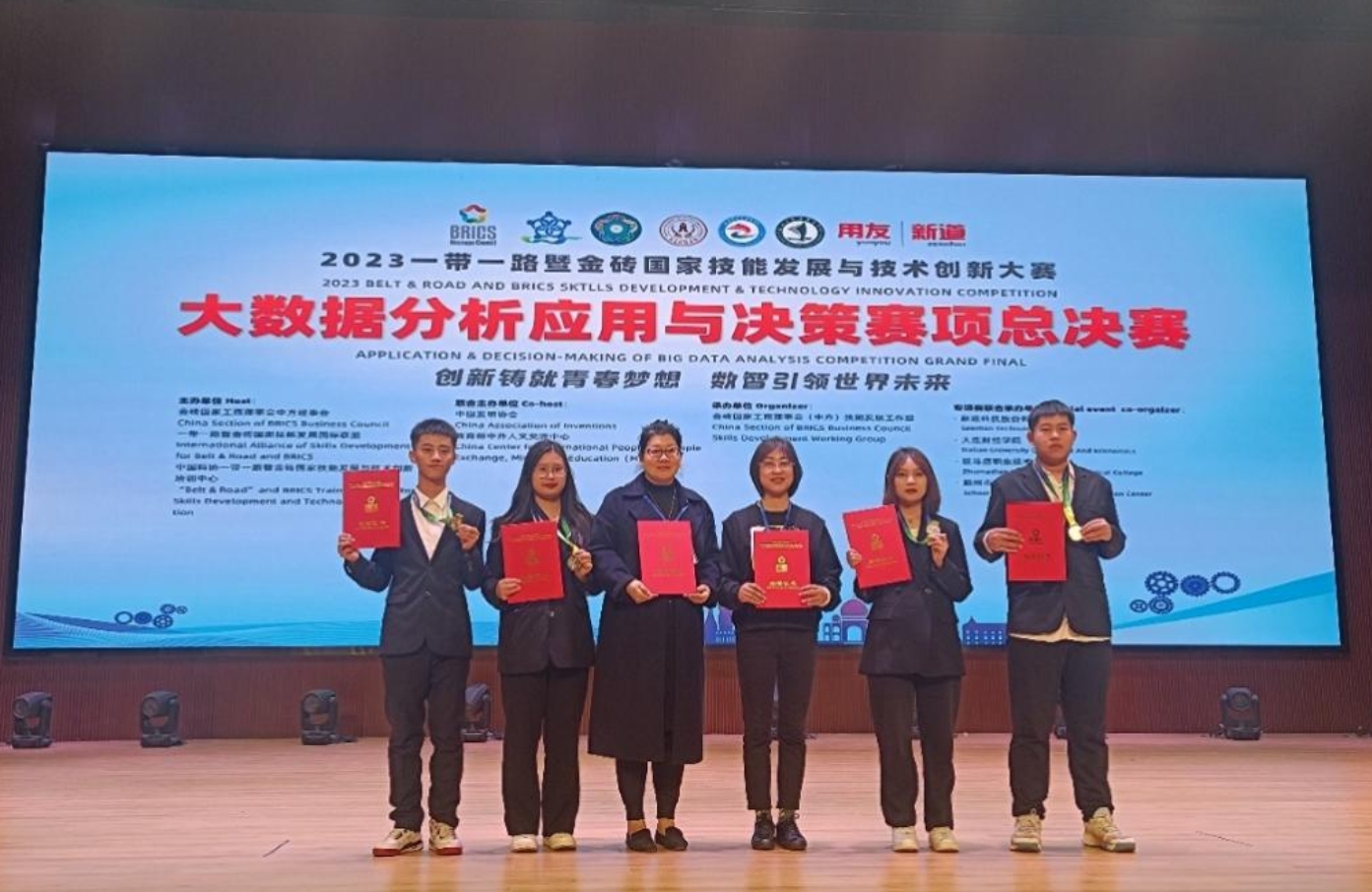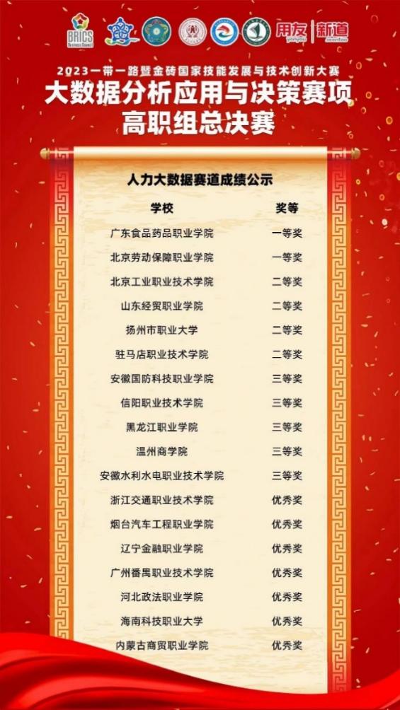 11月24-26日,2023一带一路暨金砖国家技能发展与技术创新大赛大数据分析应用与决策赛项高职组别全国总决赛在河南省驻马店职业学院举办,我校文法与管理学院李娜、李静静两位老师带领赵宏妍、计心岩、牛宇森、郑凯文四位学生荣获人力大数据赛道二等奖。