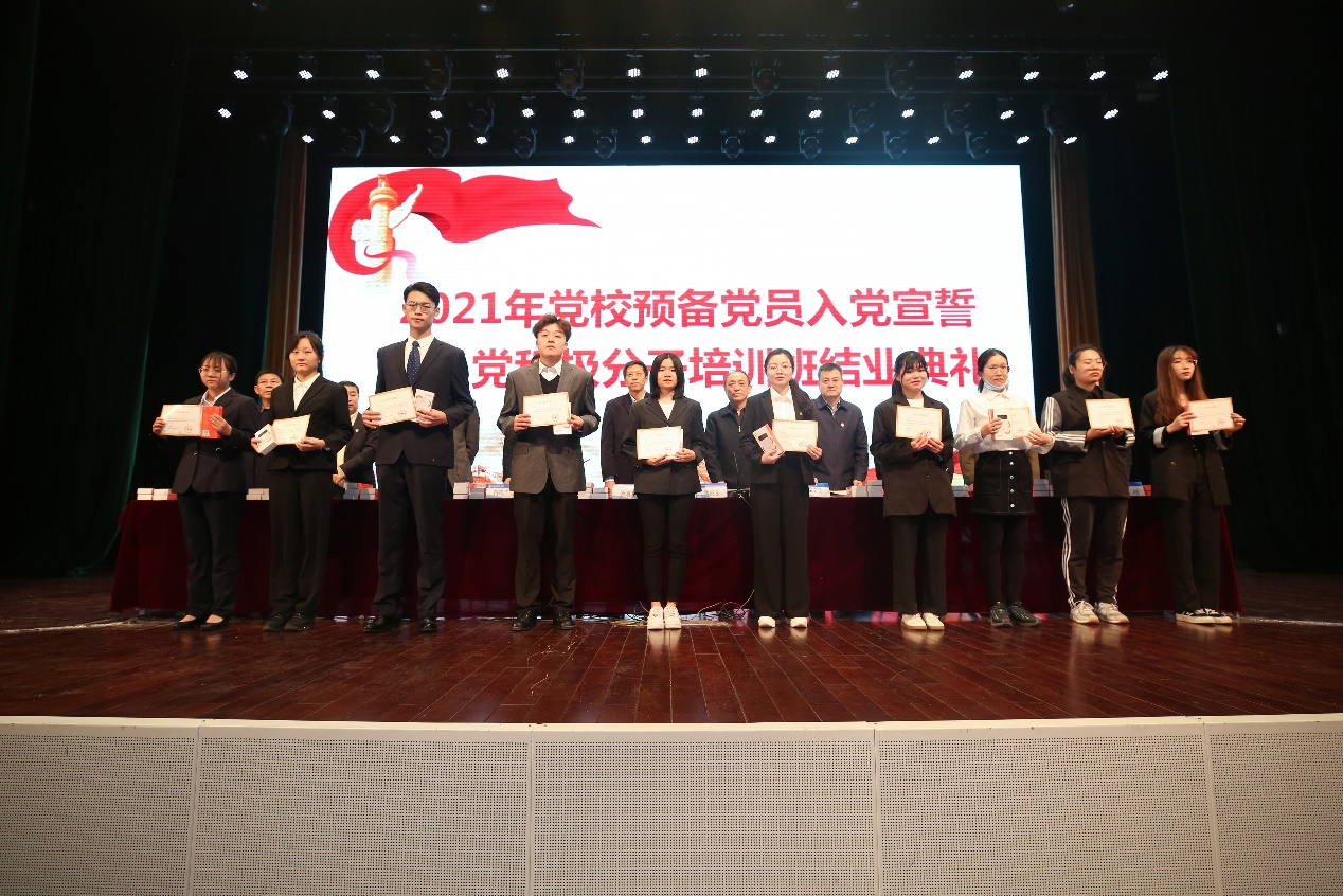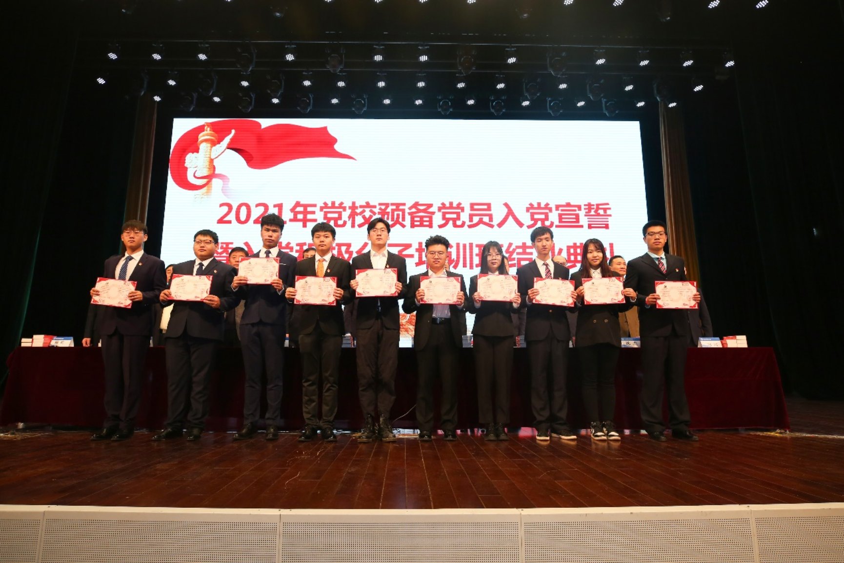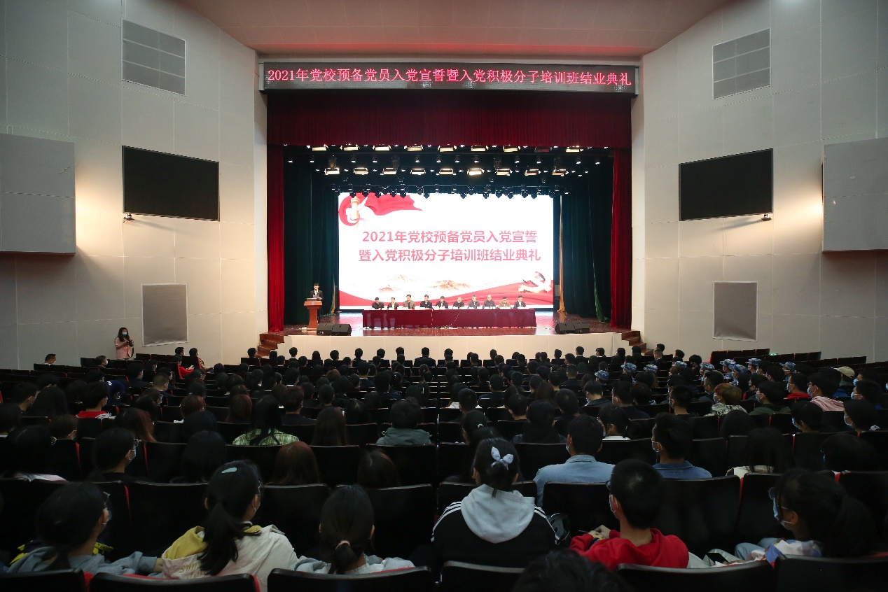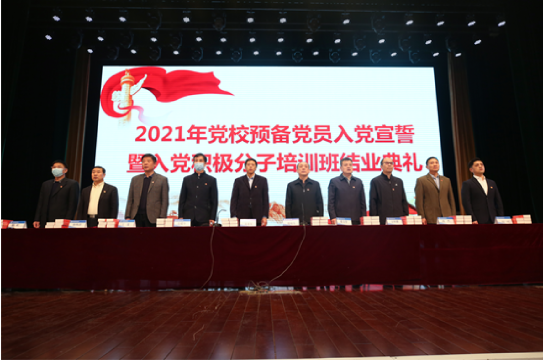 2021年4月9日中午,我校在礼堂举办2021年党校预备党员入党宣誓暨入党积极分子培训班结业典礼。党委书记、党校校长高喜军、党委副书记、党校副校长魏晓东、组织部部长苗耀华、学工处处长梁文学、团委书记郑兴、各二级学院党总支书记、学生党支部书记以及57名预备党员、551名院校两级入党积极分子培训班的合格学员参加了典礼。会议由魏晓东副书记主持。