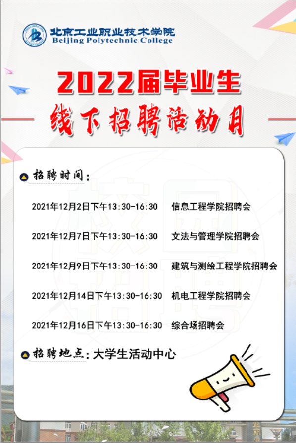 为落实北京市就业工作要求,促进我校毕业生更充分,更高质量就业,我校与教委就业创业指导中心联合举办了2022届毕业生校园联合双选会。按照疫情防控政策要求,本次双选会从12月2日至16日,每周二、周四分专业和分学院举办,吸引了近100家优质用人单位参加,提供就业岗位800余个,涵盖了爱体育手机官方网站入口各专业。