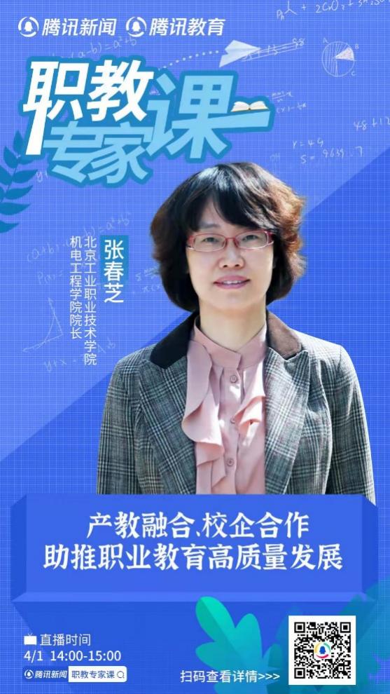 2022年4月1日下午,我校张春芝教授应邀在腾讯视频《职教专家课》直播栏目中开讲,以《产教融合、校企合作,助推职业教育高质量发展》为题向大家带来一场精彩的报告,在线观看人数达20余万人,反响热烈。