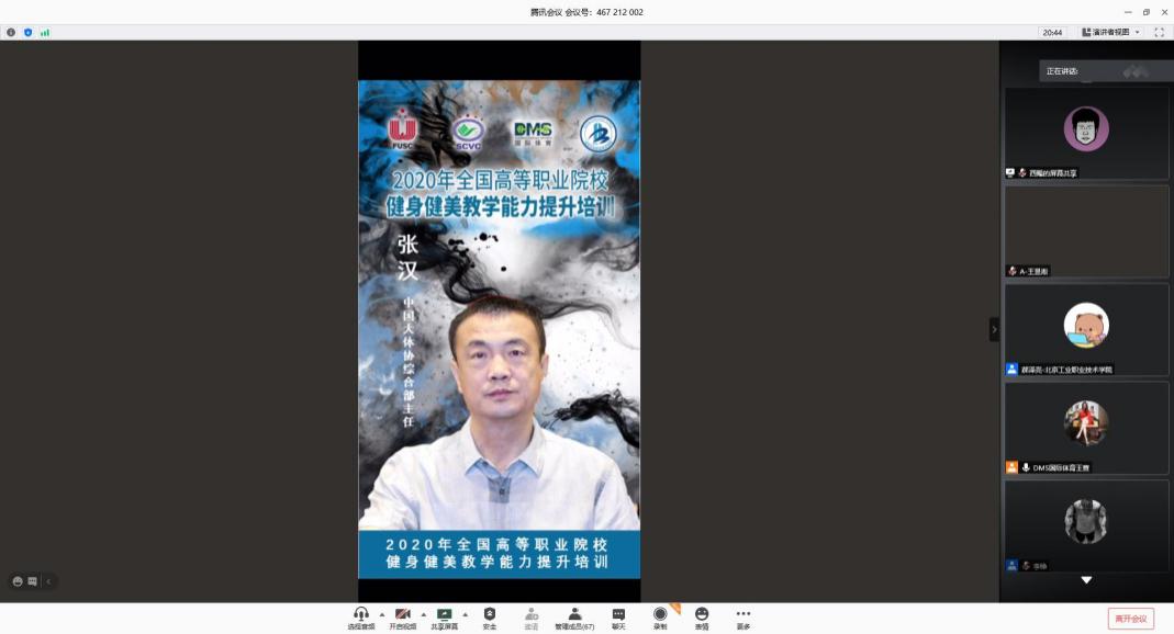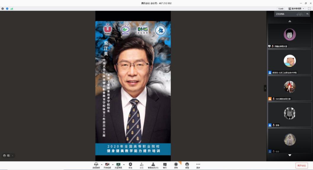 由我校承办的2020年全国高等职业院校健身健美教学能力提升培训班,于9月26日早上8:40在线上开班。中国大学生体育协会职业教育爱体育手机官方网站入口体育工作委员会主席、爱体育手机官方网站入口校长安江英,中国大学生体育协会综合部主任张汉,中国大学生体育协会职业教育爱体育手机官方网站入口体育工作委员会秘书长贾书申,北京梦肌肉体育发展有限责任公司CEO王萱等领导嘉宾出席线上开班仪式。