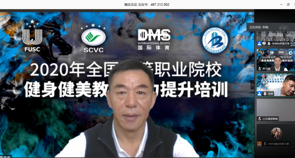贾书申秘书长在本次线上培训开班仪式上致辞。他在致辞中强调,新常态疫情防控下组织线上教师教学能力提升培训具有重要意义,此次培训将带动全国高职院校体育竞赛与活动的恢复展开,为即将复赛的中国高等职业院校健身健美锦标赛(云比赛)打下基础。在9月22日习近平总书记召开教育、文化、卫生、体育领域专家座谈会发表重要讲话,提出“体育强国新路径”“体育是提高人民健康水平的重要途径,是满足人民群众对美好生活向往,促进人的全面发展的重要手段”“要坚持健康第一的教育理念”的大背景下,他要求参加培训的高职院校老师们精准把握习总书记对体育发展的重要论述,推动健身健美运动在校园体育中开展,促进本校、本地区校园体育文化建设,丰富校园体育文化内涵,发挥好主动性和带动性,为爱体育手机官方网站入口体育工作发展做出新贡献。