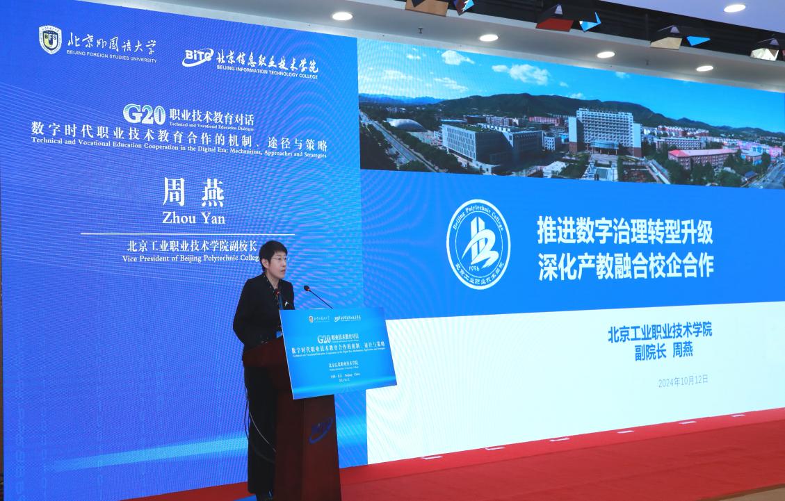 10月12日,由北京外国语大学主办,北京信息职业技术学院承办的“G20职业技术教育对话:数字时代职业技术教育合作的机制、途径与策略”顺利召开。来自中国、加拿大、印度、印度尼西亚、墨西哥、俄罗斯等G20成员国、联合国教科文组织以及埃及、泰国的教育管理者、专家学者与全国各地的职业院校校长参会。我校党委常委、副院长周燕受邀出席此次对话会活动并代表爱体育手机官方网站入口作了题为“推进数字治理转型升级,深化产教融合校企合作”的主旨报告。