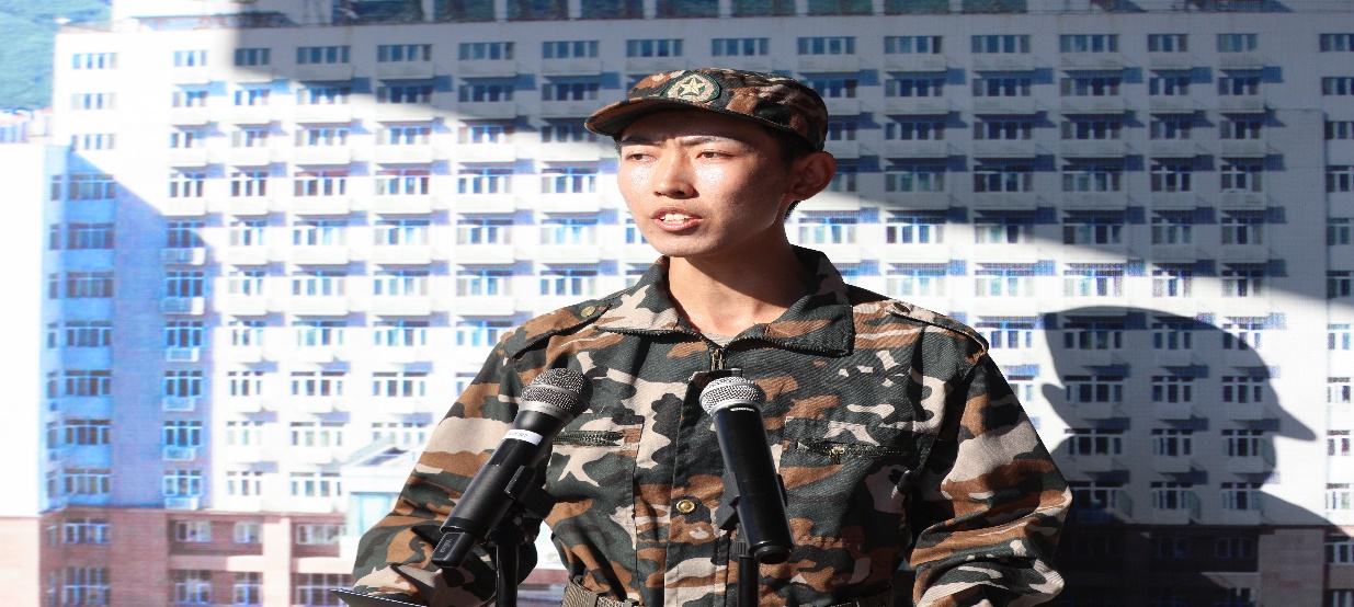 军训优秀学员代表机电学院张至成分享了自己在军训期间的感受,同时也与同学们共勉:要把军训中收获的热情、毅力和必胜的信心带到学习中去,借一腔拼搏奋斗的热血,借一份气壮山河的努力,奔涌出时代的强音!