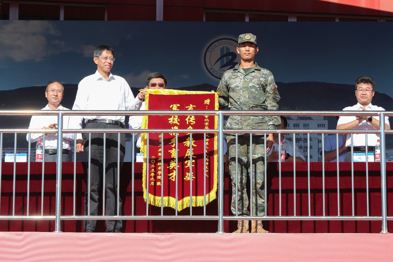 本次军训,同学们磨练了意志,锤炼了品质,提高了身体素质,这一切都离不开部队领导的重视和教官的辛勤付出,为表达我校真挚的感谢,校党委书记高喜军向军训官兵赠送锦旗。