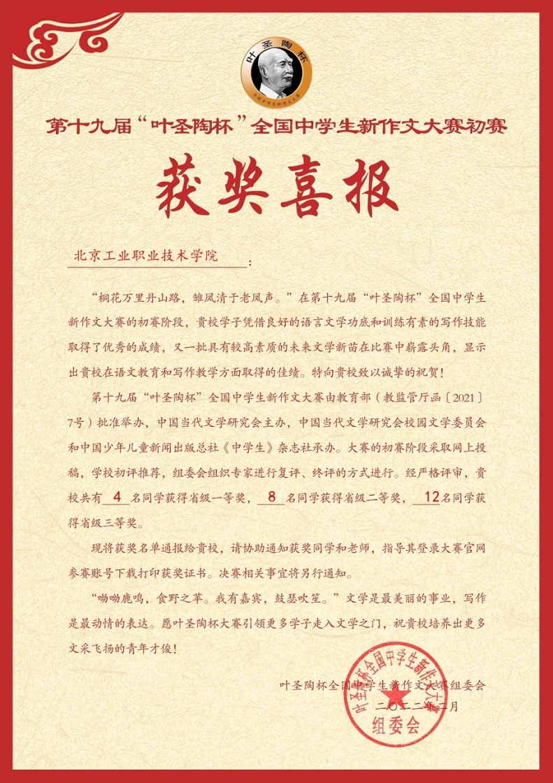 第十九届“叶圣陶杯”全国学生新作文大赛是教育部批准举办的全国学生竞赛活动,大赛于2021年9月开赛,初赛(各省级竞赛)采用线上投稿的方式,全国共收到稿件77万余份,我校共组织238名同学参加比赛,共有24名同学获奖,本届大赛以“弘扬叶圣陶教育思想,助力语文新课程改革;引领学生健康写作,发现与培养文学新苗”为宗旨。本次竞赛全面贯彻党的教育方针、文艺方针,对于进一步激发学生写作热情,提高学生文学素养具有重要作用。