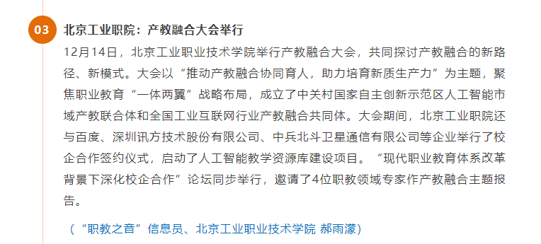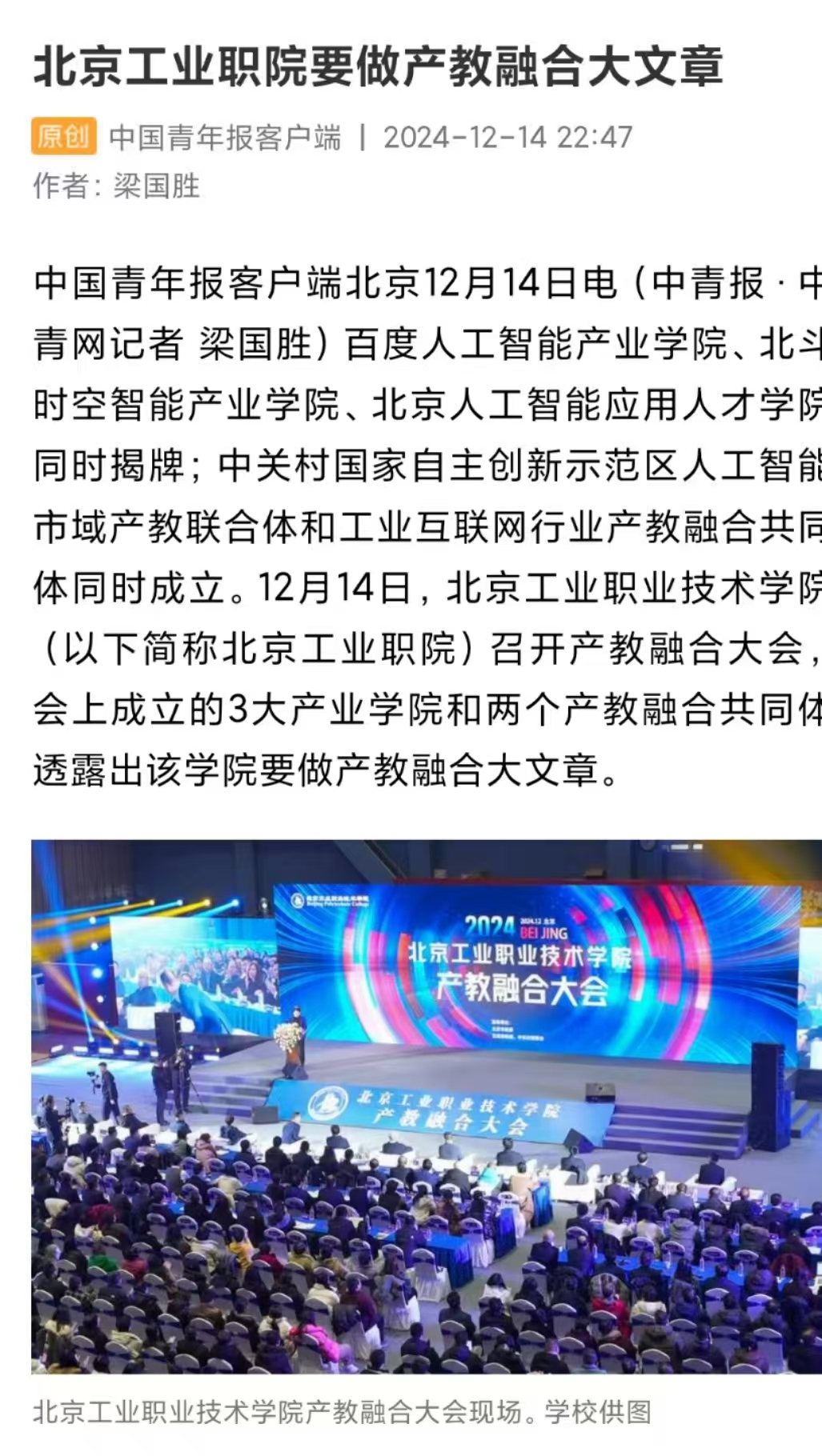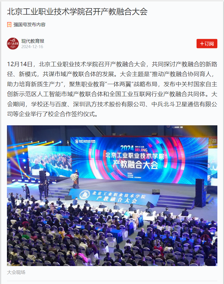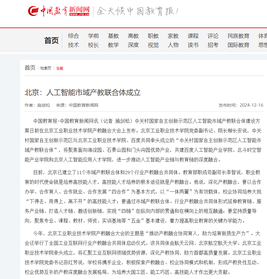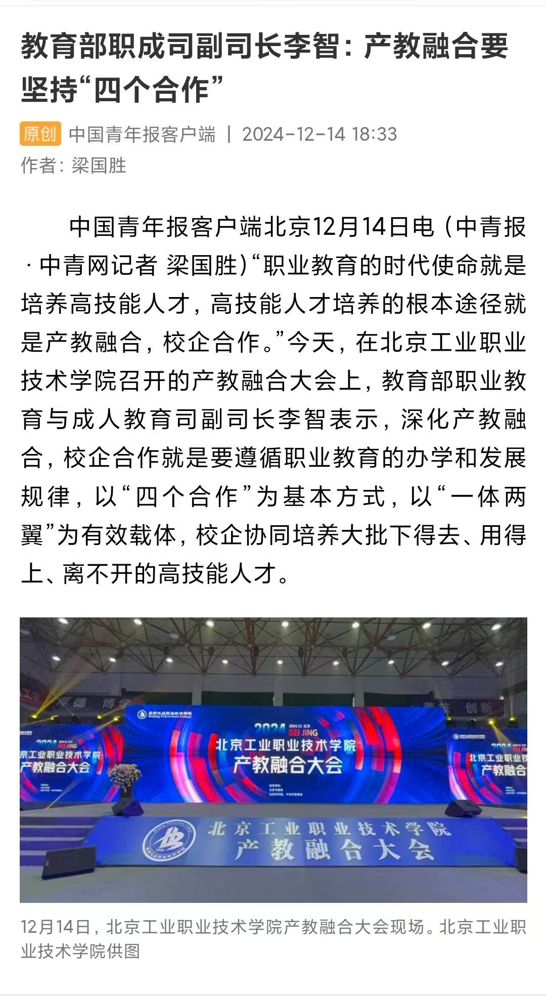 日前,我校召开产教融合大会,发布中关村国家自主创新示范区人工智能市域产教联合体和全国工业互联网行业产教融合共同体,进一步提高市域产教联合体和行业产教融合共同体建设水平。促进科技创新和产业升级,为培育发展新质生产力注入新动能,为区域经济社会发展提供人才支持和智力支撑。中国教育电视台、北京电视台、中国青年报、中国教育报、北京日报、现代教育报等众多媒体纷纷对爱体育手机官方网站入口要做产教融合大文章进行了报道。学习强国、职教之音、北京教育融媒体中心、湘微职教、百家号、搜狐网等媒体进行了转载。