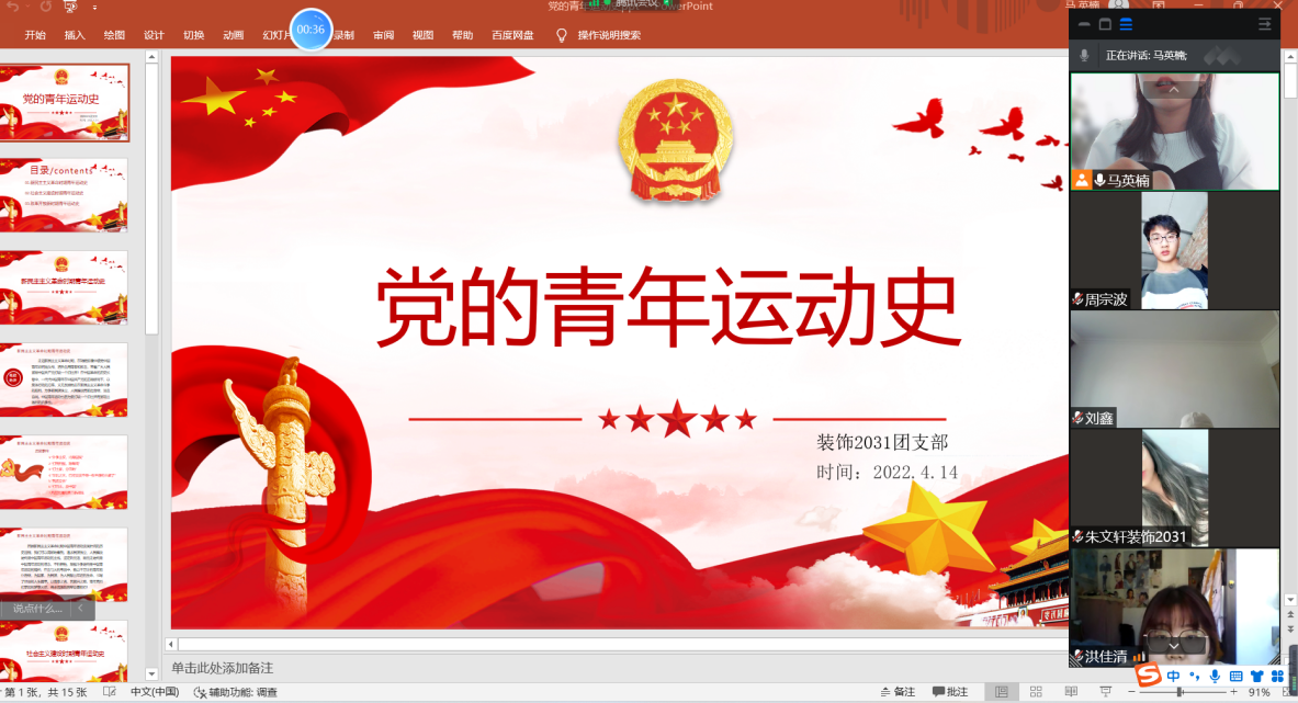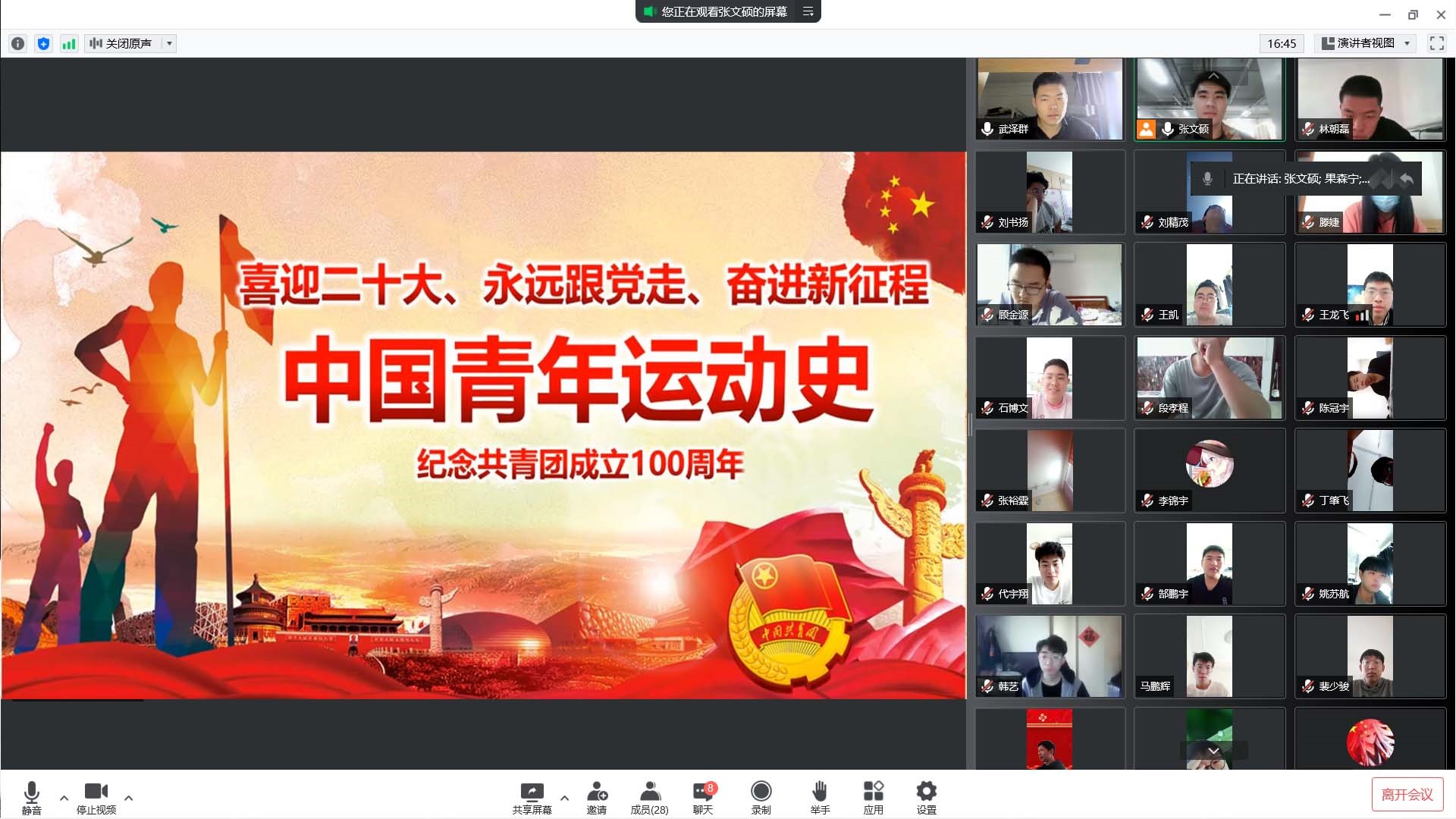 在此次专题学习活动中,各团支部根据防疫工作实际,贯彻落实疫情防控要求,在线上围绕“党的青年运动史”主题,以观看视频、专题发言、集体讨论等形式展开学习。同学们更加深刻了解了百年来无数青年在党的领导下所做出的杰出贡献,深切感受到了这一段艰辛而光辉的发展历程。