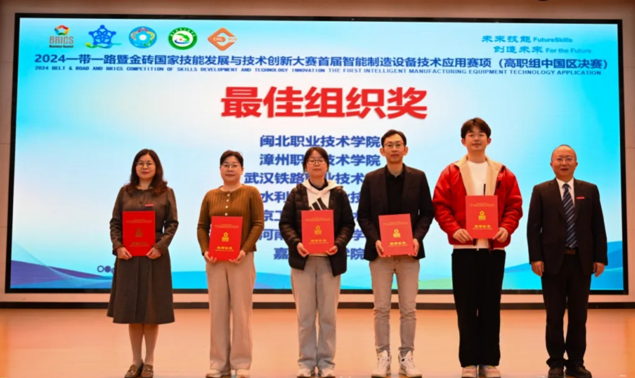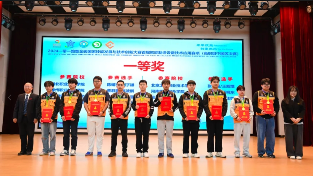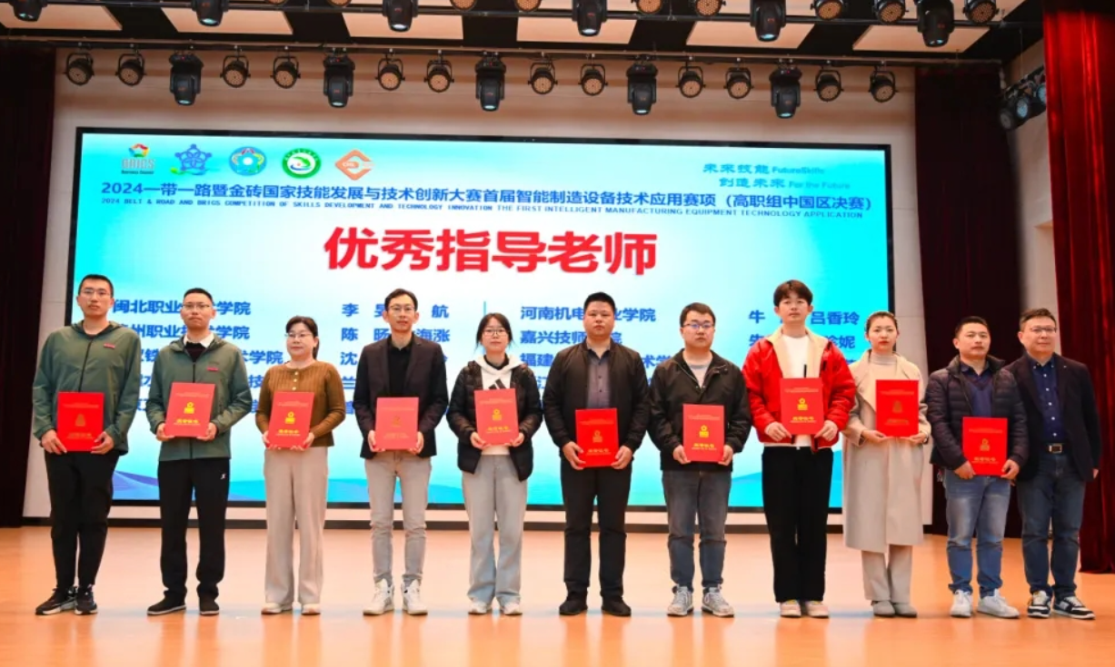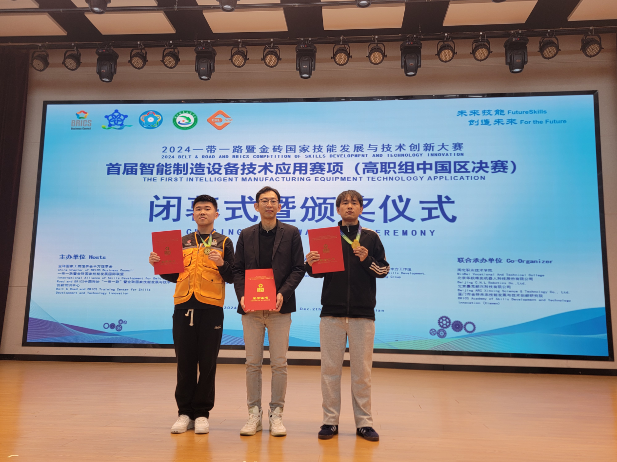 2024年12月2日,在2024一带一路暨金砖国家技能发展与技术创新大赛智能制造设备技术应用赛项(高职组)中,我校机电工程学院工业机器人2231班的张宇涵和王殿焜同学,历经两天的鏖战,凭借卓越的技艺和默契的团队配合,从全国90多支报名参赛队伍中脱颖而出,最终摘得国内赛决赛一等奖(金牌)。指导老师曾锦翔、张韬获优秀指导教师奖,爱体育手机官方网站入口获得最佳组织奖。