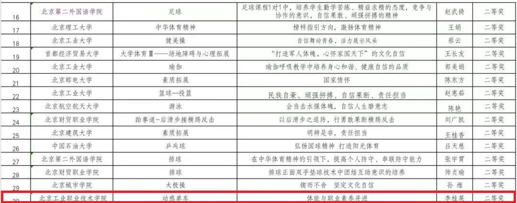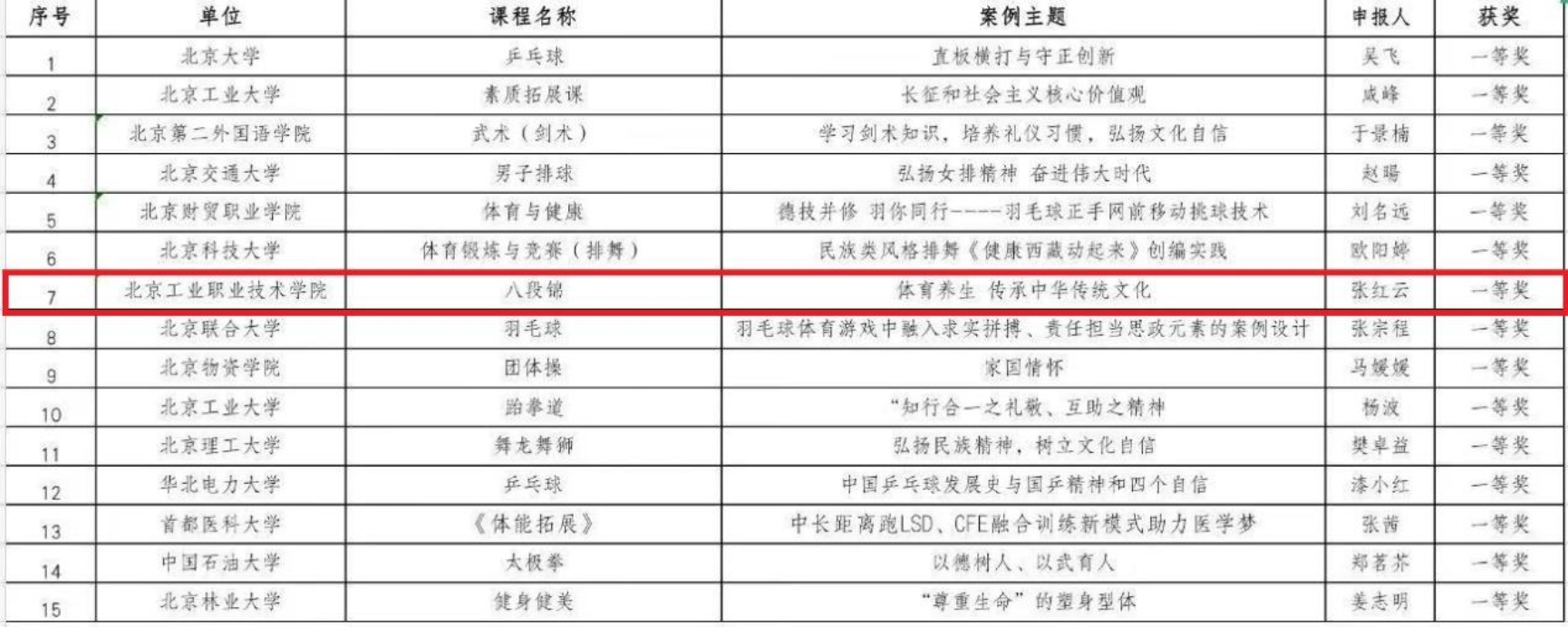 其中,张红云负责的八段锦团队《体育养生 传承中华传统文化》课程思政教学案例荣获一等奖、李桂英负责的动感单车团队《体能与职业素养并进》课程荣获二等奖,王勇、贾一、李玉超负责的团队教学案例分别荣获三等奖。在取得团队殊荣的同时,我校也从众多首都高校中脱颖而出,荣获首都高等爱体育手机官方网站入口第一届体育课程思政教学案例征集工作“优秀组织奖”。