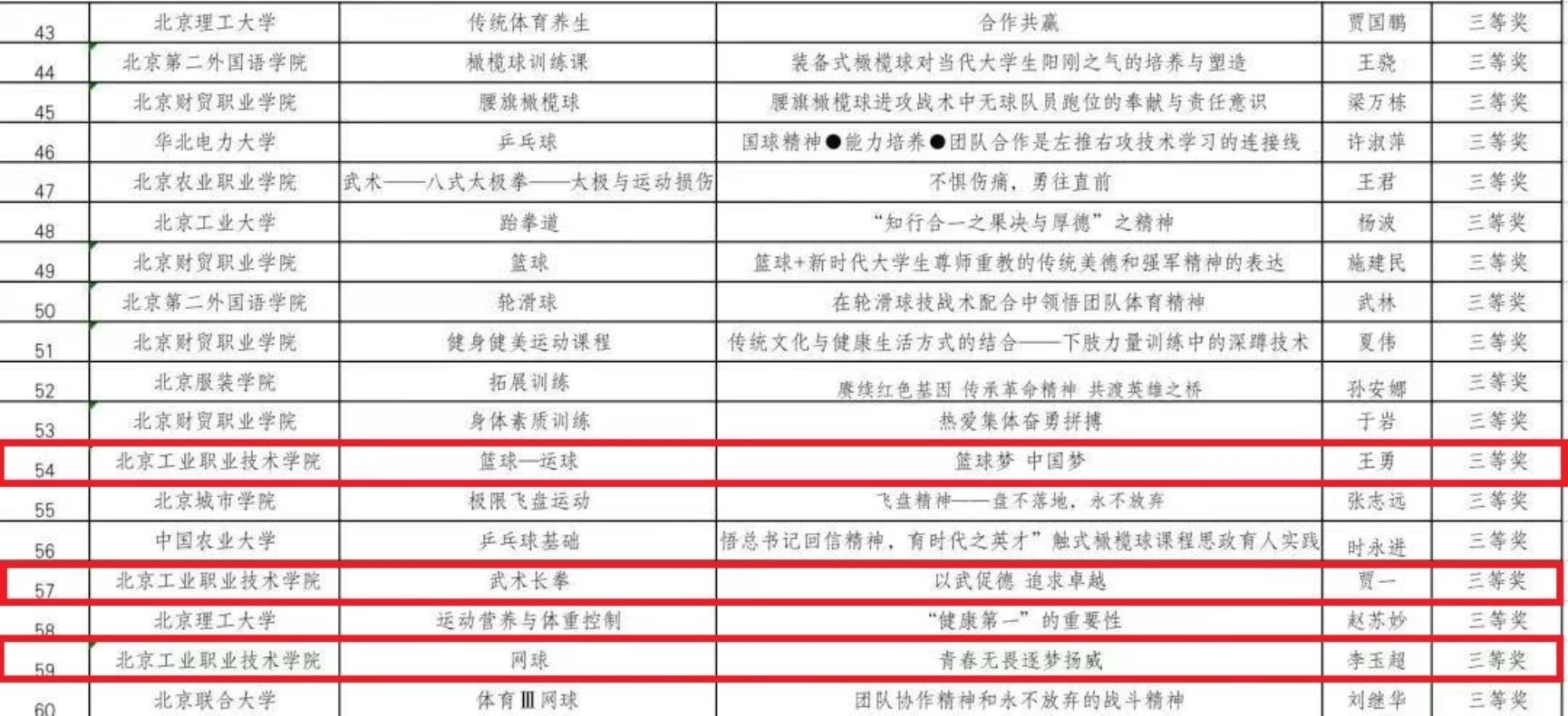 为深入贯彻落实习近平总书记关于教育、体育的重要论述和全面落实全国教育大会精神,根据中共中央、国务院《深化新时代教育改革评价总体方案》等文件的工作部署,深入落实三全育人工作,首都高校体育思政研究会于2023年6月开展体育课程思政教学案例的征集工作。我校体育部针对此项工作,成立5个体育项目团队进行教学案例撰写和课程录制工作,提交申报了八段锦、动感单车、武术、篮球、网球等五个项目课程思政教学案例。经首都高校体育思政研究会专家组的严格评审,我校体育部申报的五门课程教学案例全部奖项。