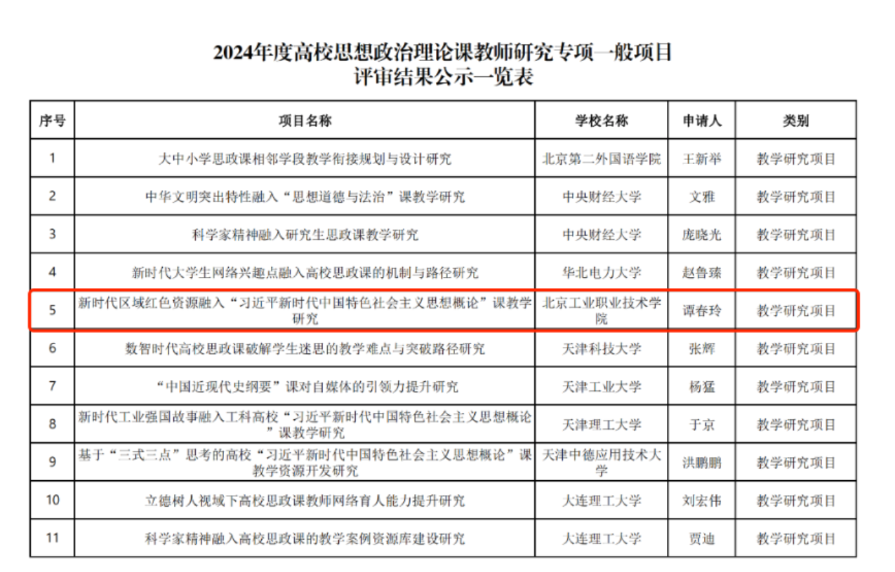 在全国所有高校中,本年度思想政治理论课教师研究专项一般项目共立项200项,共有170所高校入选。本年度北京高校(含本科院校和职业高校)入选教育部2024年度高校思想政治理论课教师研究专项“教学研究项目”5项,“教学方法改革择优推广项目”1项,“优秀中青年思政课教师择优资助项目”2项,“教学研究青年项目”4项,共计11项。我校谭春玲老师主持的项目是北京市所有入选项目中唯一的职业院校项目,这充分展示了我校马克思主义学院教师在思想政治理论课教学研究中的前瞻性思维和积极实践探索成果,这将有力地提升我校马院马克思主义与思政课教学研究在全国高校中的影响力,并助力我校人文社科研究取得更高水平。
