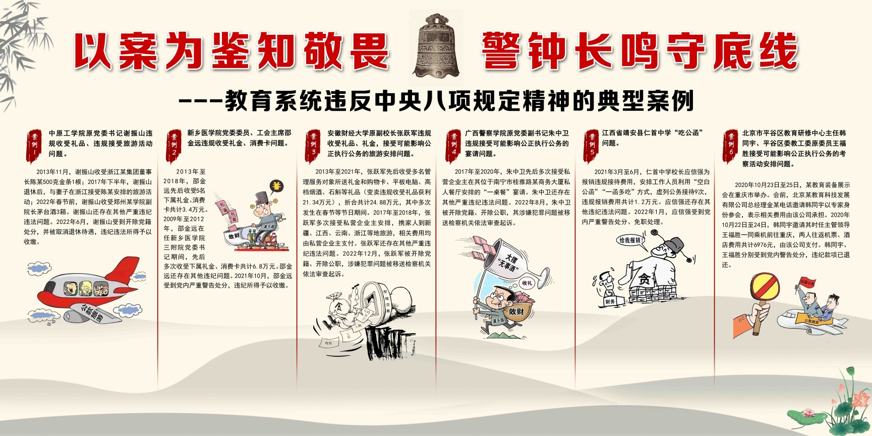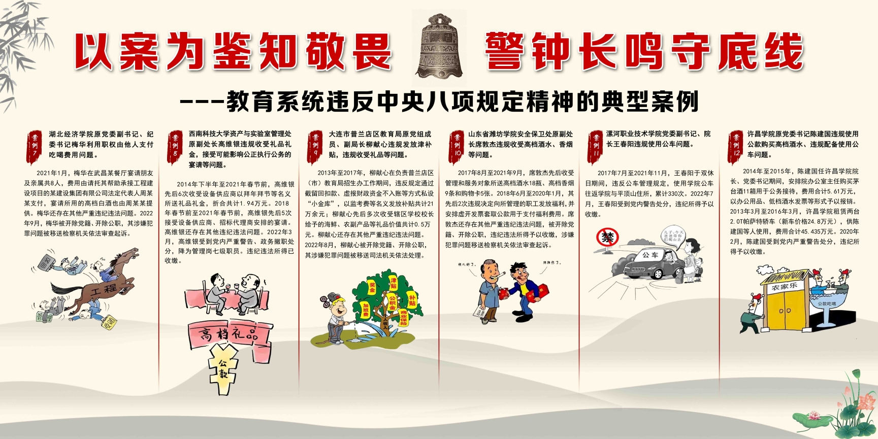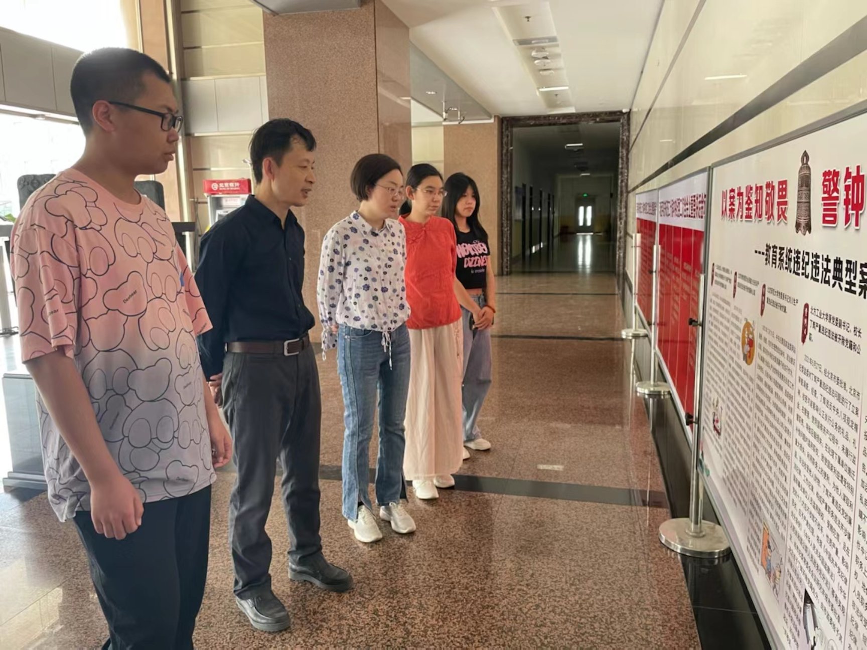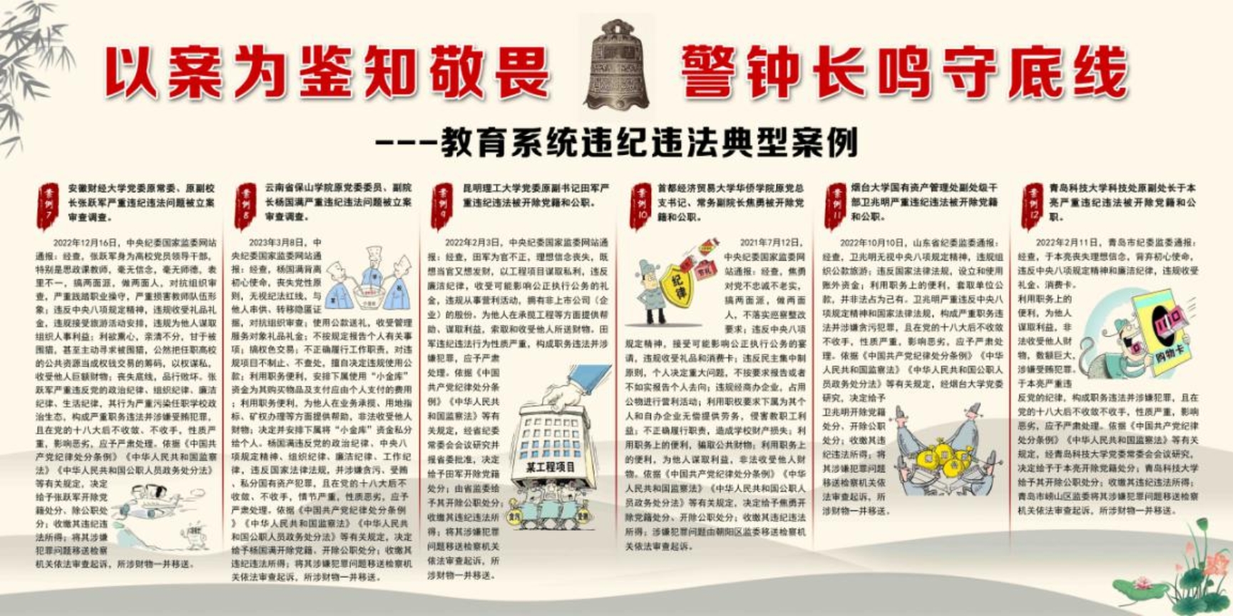 为深入贯彻党的二十大精神,推动学习贯彻习近平新时代中国特色社会主义思想主题教育走深走实,不断强化党员干部廉洁意识,筑牢拒腐防变思想防线,爱体育手机官方网站入口纪委制作了一期警示教育宣传展板,在爱体育手机官方网站入口匠心楼一层大厅进行展示。专题展主要分三个部分“习近平总书记在二十届中央纪委二次全会上的讲话金句、警钟长鸣——教育系统违纪违法典型案例、严守底线——教育系统违反中央八项规定典型案例”。