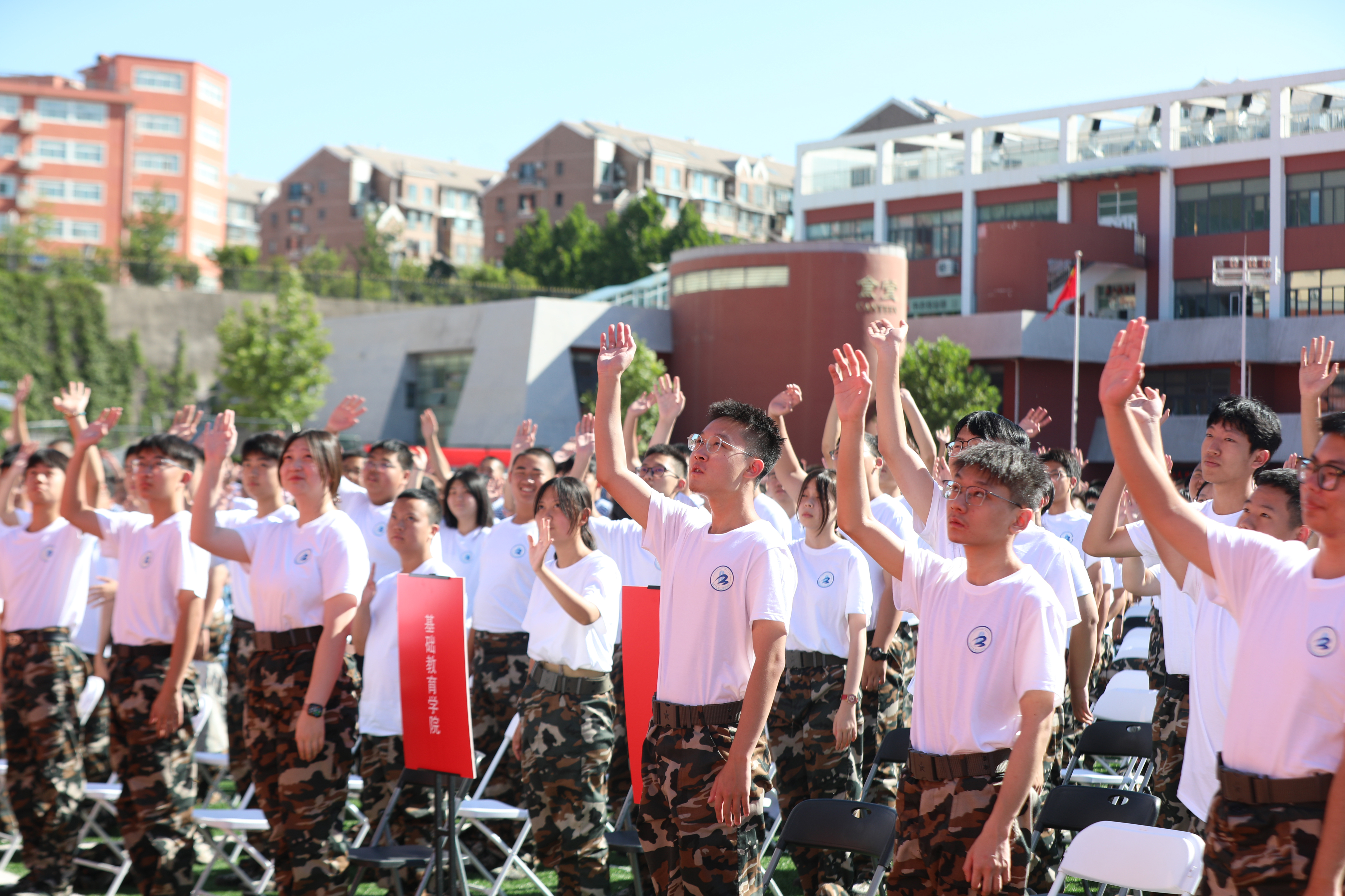 开学典礼结束后,进行新生军训开营仪式。全体师生庄严肃立,迎接校旗。