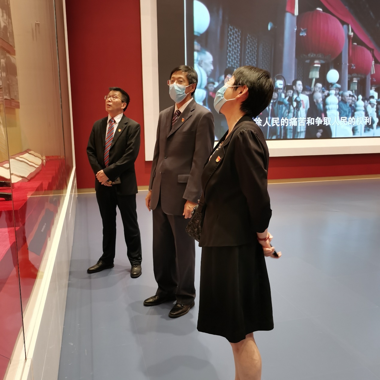 高书记带领大家与北京市教育系统各单位理论学习中心组同志们一起集体有序参观,一边认真听讲解,一边不时停下脚步仔细观看珍贵的文物实物和档案资料,一路参观、一路思考,用心感悟波澜壮阔的百年党史和其中蕴含的伟大精神。