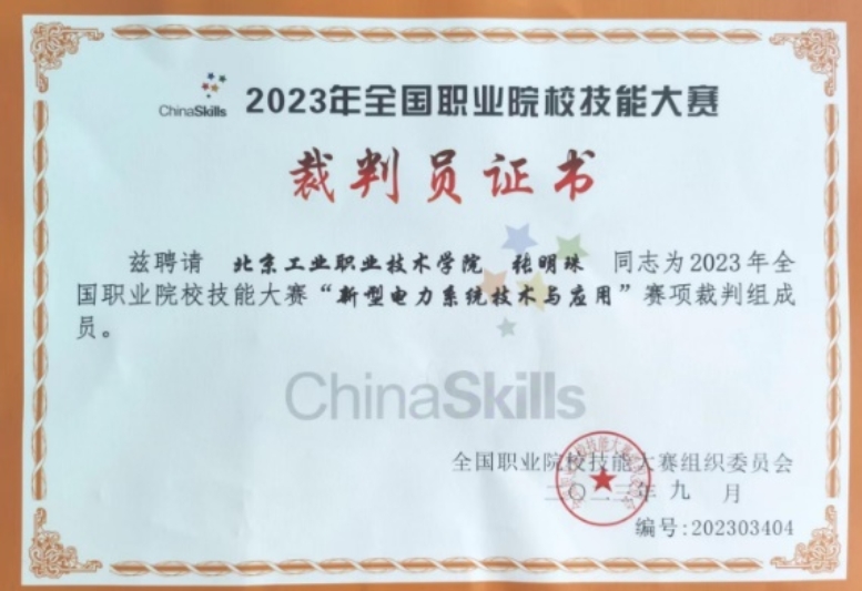 她发挥双师、双语优势,以坚实的博士理论基础及实操教学能力丰富个人的企业实践经历,2023年前往企业开展4期技术培训。2012年,她被公派前往明尼苏达大学访学,多年来践行了职业院校的双语教学;2017年,获批北京市教委“青年拔尖人才”项目,服务企业技术创新;2018年,在全国职业院校学生技能大赛中被教育部授予“优秀指导教师”荣誉称号;2021年,服务北京冬奥会延庆村场馆管理;2022年,担任施耐德电气(中国)/特聘技术专家、北京西城区数字化改造项目评审专家;2023年,担任全国机械行指委智能制造专执委专家委员、全国职业技能大赛新型电力系统技术与应用赛项裁判。